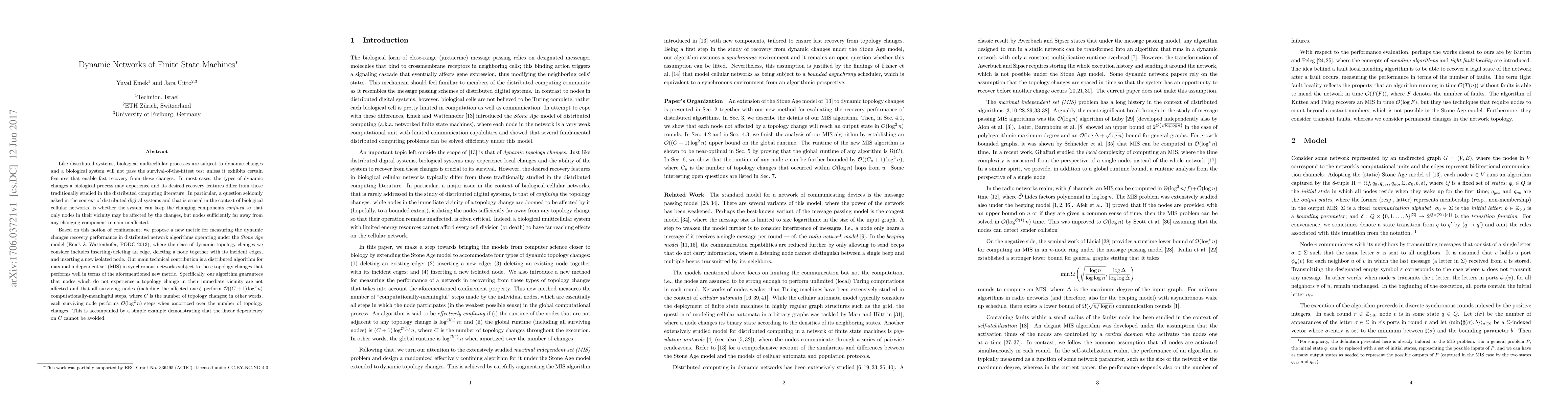 Like distributed systems, biological multicellular processes are subject to dynamic changes and a biological system will not pass the survival-of-the-fittest test unless it exhibits certain features that enable fast recovery from these changes. In particular, a question that is crucial in the context of biological cellular networks, is whether the system can keep the changing components \emph{confined} so that only nodes in their vicinity may be affected by the changes, but nodes sufficiently far away from any changing component remain unaffected. Based on this notion of confinement, we propose a new metric for measuring the dynamic changes recovery performance in distributed network algorithms operating under the \emph{Stone Age} model (Emek \& Wattenhofer, PODC 2013), where the class of dynamic topology changes we consider includes inserting/deleting an edge, deleting a node together with its incident edges, and inserting a new isolated node. Our main technical contribution is a distributed algorithm for maximal independent set (MIS) in synchronous networks subject to these topology changes that performs well in terms of the aforementioned new metric. Specifically, our algorithm guarantees that nodes which do not experience a topology change in their immediate vicinity are not affected and that all surviving nodes (including the affected ones) perform $\mathcal{O}((C + 1) \log^{2} n)$ computationally-meaningful steps, where $C$ is the number of topology changes; in other words, each surviving node performs $\mathcal{O}(\log^{2} n)$ steps when amortized over the number of topology changes. This is accompanied by a simple example demonstrating that the linear dependency on $C$ cannot be avoided.