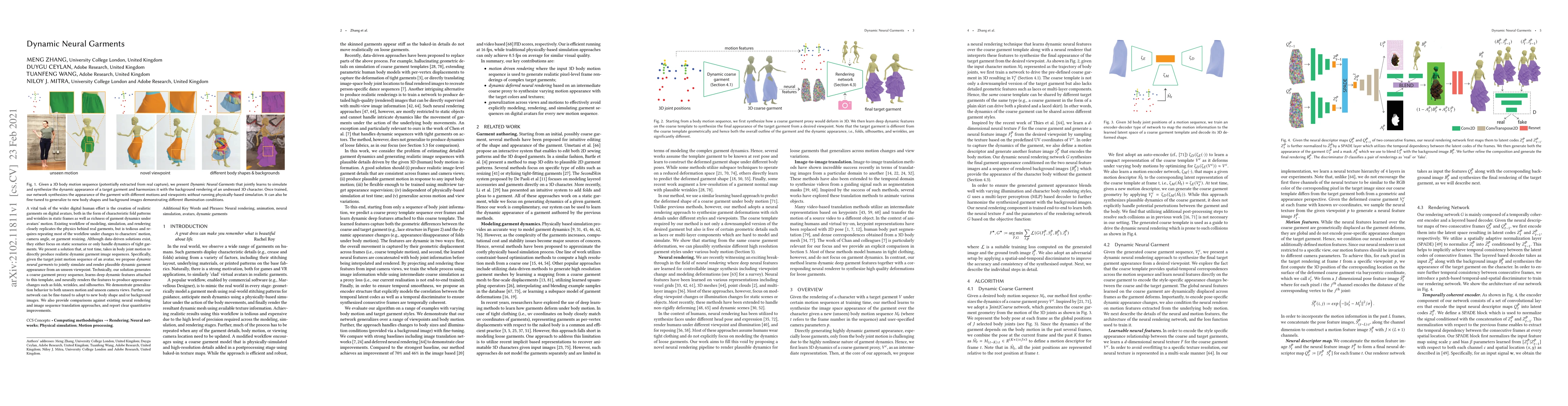 This paper introduces dynamic neural garments to generate realistic dynamic garment images from body joint motion, overcoming the limitations of existing physics-based and data-driven methods. The proposed solution simulates and renders dynamic garment appearance from unseen viewpoints, demonstrating generalization to new motions and camera angles.