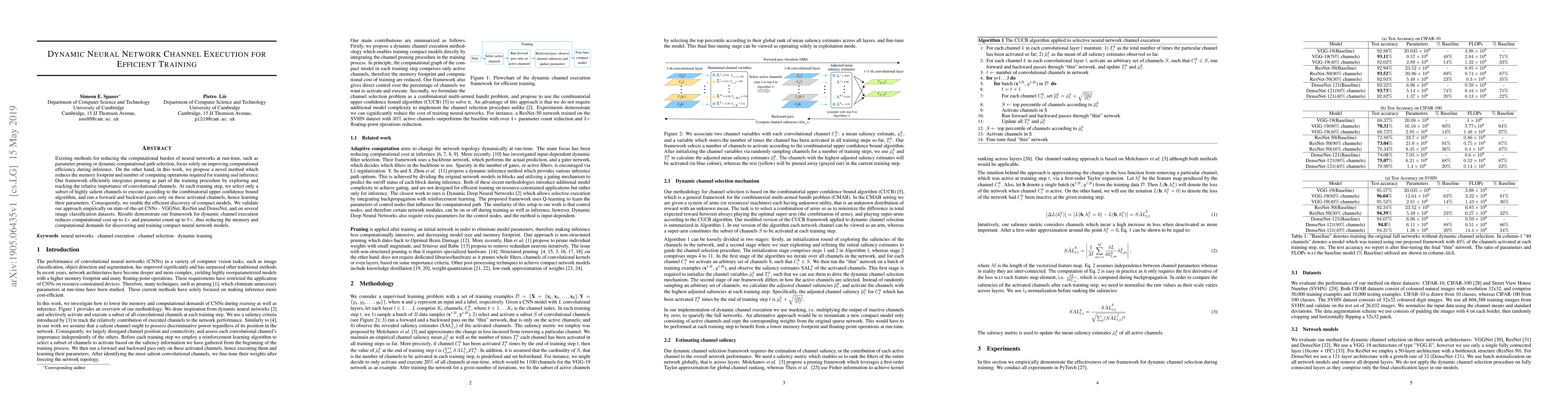 This paper proposes a dynamic neural network channel execution method that reduces computational and memory costs during both training and inference by selectively activating salient convolutional channels. Empirical results show up to 4x reduction in computational cost and 9x reduction in parameters across various CNN architectures.