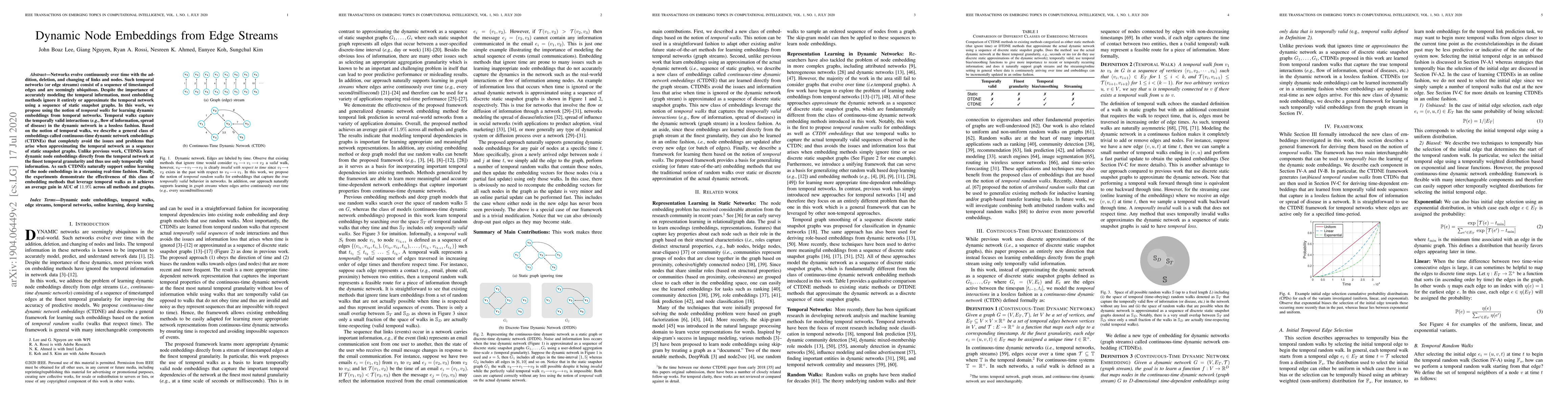 Networks evolve continuously over time with the addition, deletion, and changing of links and nodes. Such temporal networks (or edge streams) consist of a sequence of timestamped edges and are seemingly ubiquitous. Despite the importance of accurately modeling the temporal information, most embedding methods ignore it entirely or approximate the temporal network using a sequence of static snapshot graphs. In this work, we propose using the notion of temporal walks for learning dynamic embeddings from temporal networks. Temporal walks capture the temporally valid interactions (e.g., flow of information, spread of disease) in the dynamic network in a lossless fashion. Based on the notion of temporal walks, we describe a general class of embeddings called continuous-time dynamic network embeddings (CTDNEs) that completely avoid the issues and problems that arise when approximating the temporal network as a sequence of static snapshot graphs. Unlike previous work, CTDNEs learn dynamic node embeddings directly from the temporal network at the finest temporal granularity and thus use only temporally valid information. As such CTDNEs naturally support online learning of the node embeddings in a streaming real-time fashion. Finally, the experiments demonstrate the effectiveness of this class of embedding methods that leverage temporal walks as it achieves an average gain in AUC of 11.9% across all methods and graphs.