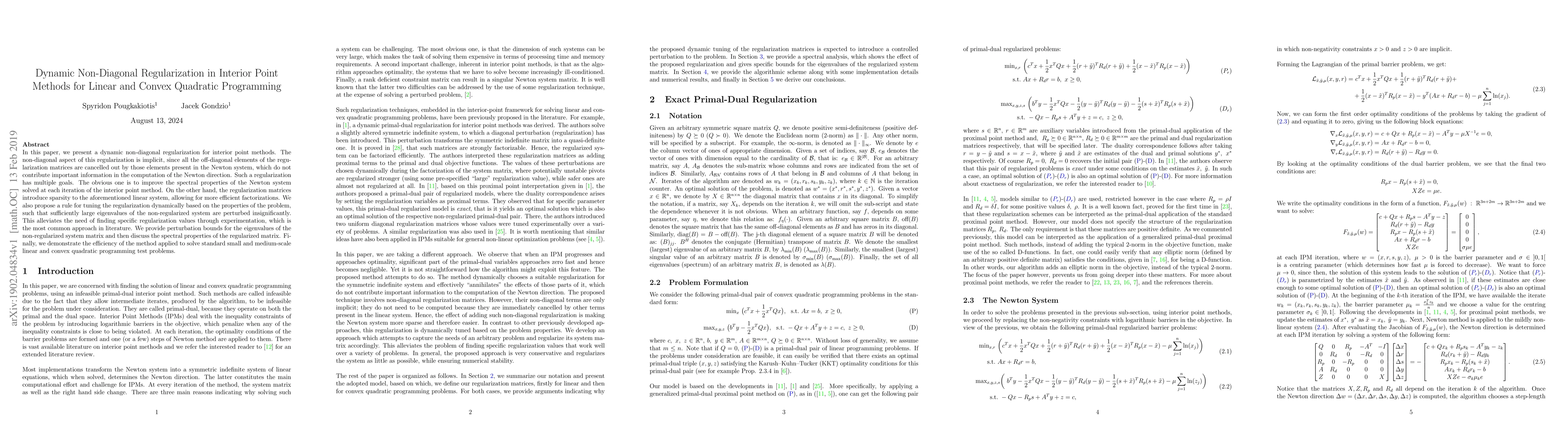 This paper introduces a dynamic non-diagonal regularization technique for interior point methods to enhance the spectral properties of the Newton system and introduce sparsity for efficient factorizations. The method dynamically tunes regularization based on problem properties, alleviating the need for specific regularization values.