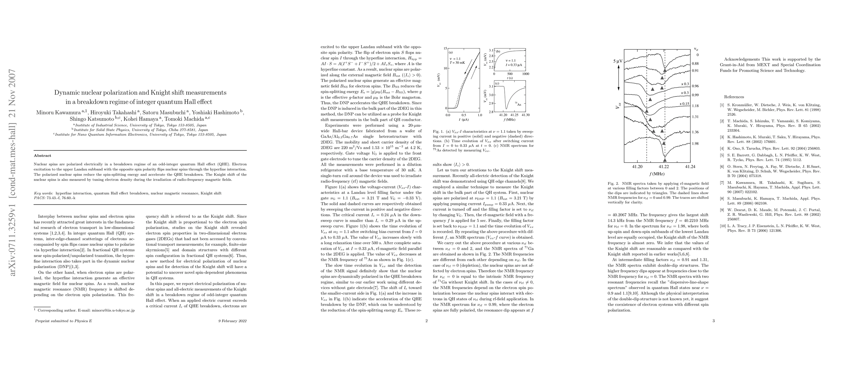 Nuclear spins are polarized electrically in a breakdown regime of an odd-integer quantum Hall effect (QHE). Electron excitation to the upper Landau subband with the opposite spin polarity flips nuclear spins through the hyperfine interaction. The polarized nuclear spins reduce the spin-splitting energy and accelerate the QHE breakdown. The Knight shift of the nuclear spins is also measured by tuning electron density during the irradiation of radio-frequency magnetic fields.