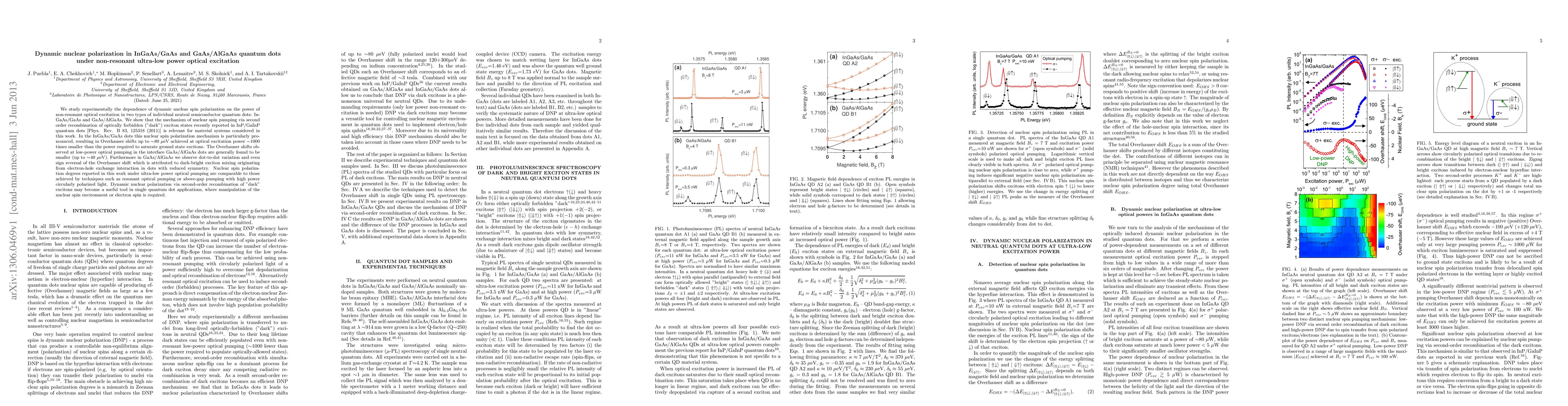 This research investigates dynamic nuclear polarization in InGaAs/GaAs and GaAs/AlGaAs quantum dots under non-resonant, ultra-low power optical excitation, revealing a nuclear spin pumping mechanism through second-order recombination of 'dark' exciton states. InGaAs/GaAs dots show pronounced nuclear spin polarization with significant Overhauser shifts, while GaAs/AlGaAs dots exhibit smaller shifts and dot-to-dot variability attributed to exciton mixing.