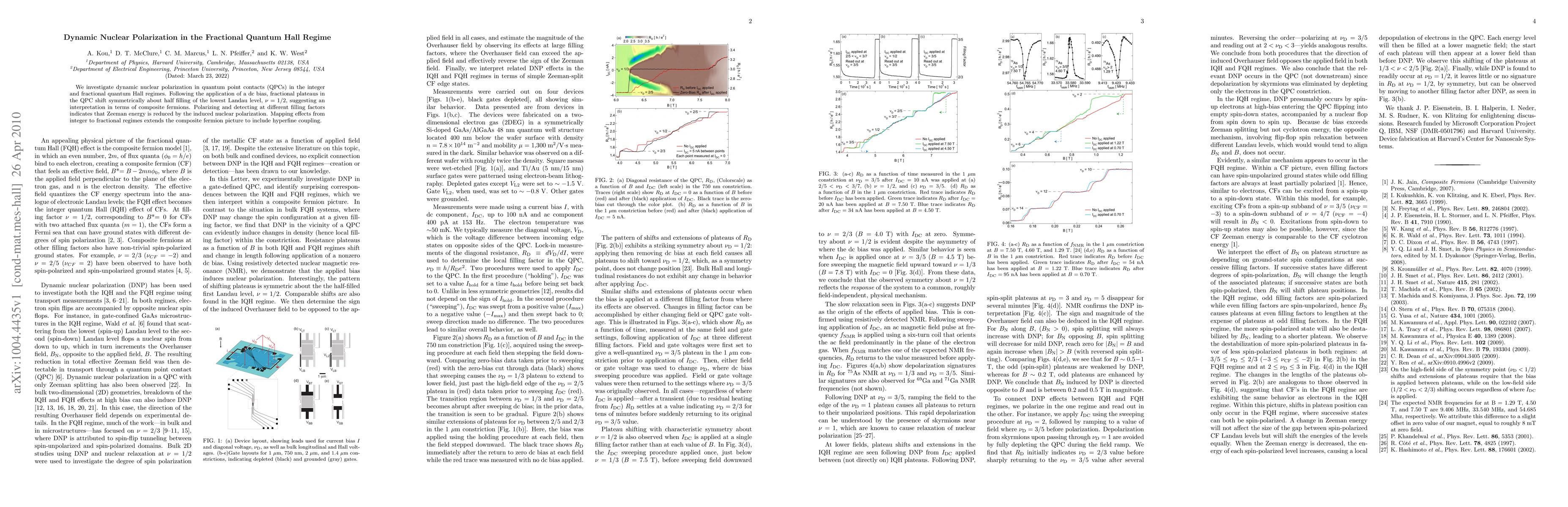 We investigate dynamic nuclear polarization in quantum point contacts (QPCs) in the integer and fractional quantum Hall regimes. Following the application of a dc bias, fractional plateaus in the QPC shift symmetrically about half filling of the lowest Landau level, \nu=1/2, suggesting an interpretation in terms of composite fermions. Polarizing and detecting at different filling factors indicates that Zeeman energy is reduced by the induced nuclear polarization. Mapping effects from integer to fractional regimes extends the composite fermion picture to include hyperfine coupling.