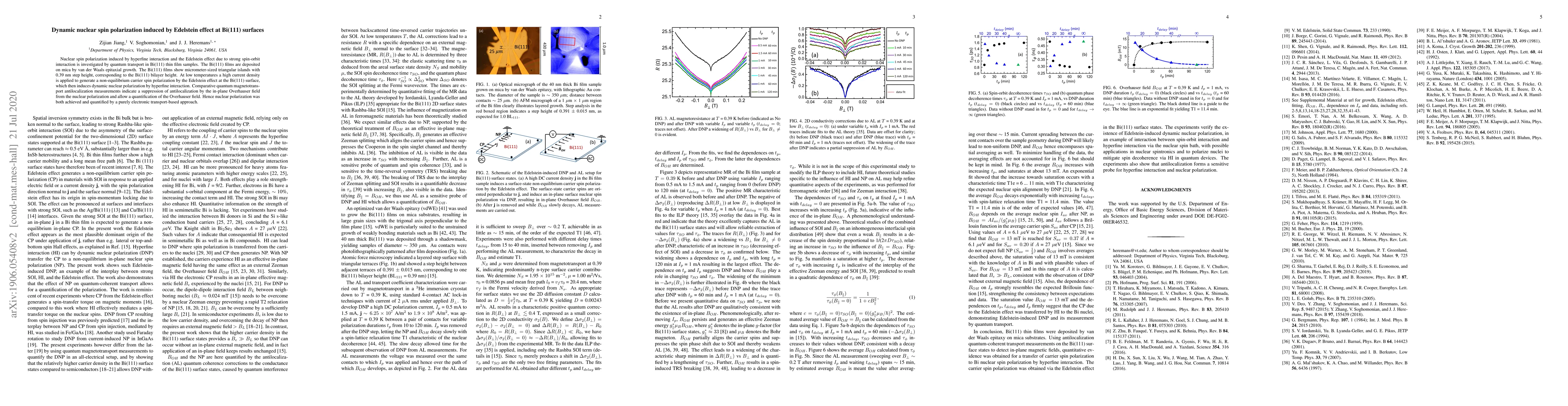 This study investigates nuclear spin polarization induced by the Edelstein effect in Bi(111) thin films, revealing dynamic nuclear polarization via hyperfine interaction under low-temperature current. Quantum transport measurements quantify the Overhauser field, demonstrating suppression of antilocalization and achieving nuclear polarization through electronic transport.