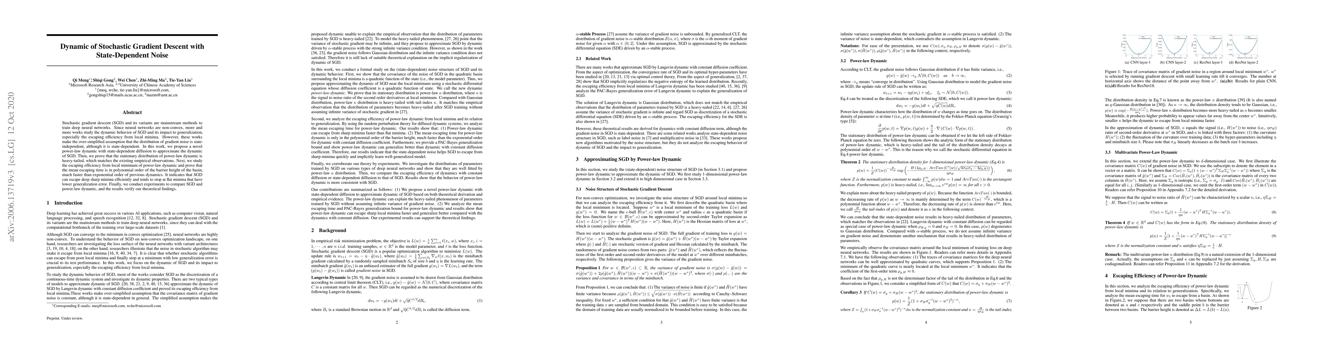 This paper studies the dynamics of stochastic gradient descent (SGD) with state-dependent noise, showing that its covariance is quadratic in the state. It proposes a novel power-law dynamic model that enables SGD to escape sharp minima exponentially faster than flat minima, significantly improving generalization.