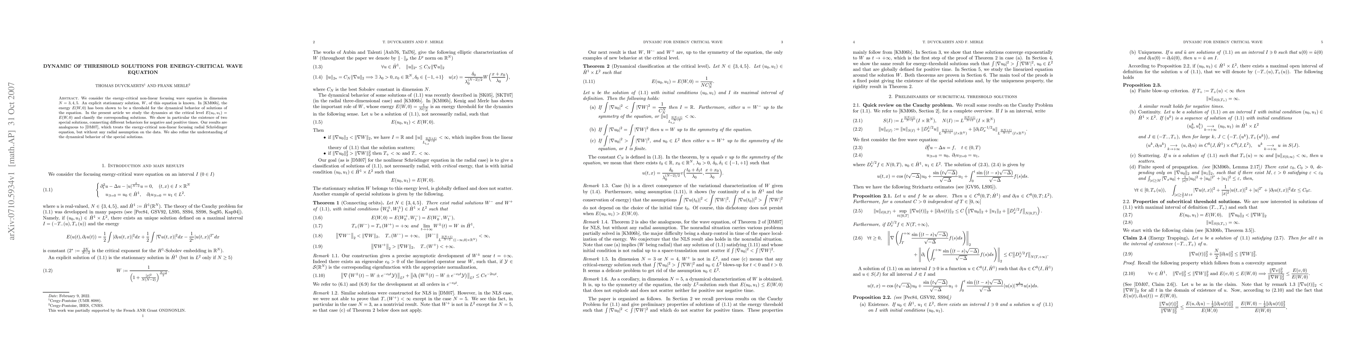 We consider the energy-critical non-linear focusing wave equation in dimension N=3,4,5. An explicit stationnary solution, $W$, of this equation is known. The energy E(W,0) has been shown by C. Kenig and F. Merle to be a threshold for the dynamical behavior of solutions of the equation. In the present article we study the dynamics at the critical level E(u_0,u_1)=E(W,0) and classify the corresponding solutions. We show in particular the existence of two special solutions, connecting different behaviors for negative and positive times. Our results are analoguous to our previous work on radial Schr\"odinger equation, but without any radial assumption on the data. We also refine the understanding of the dynamical behavior of the special solutions.