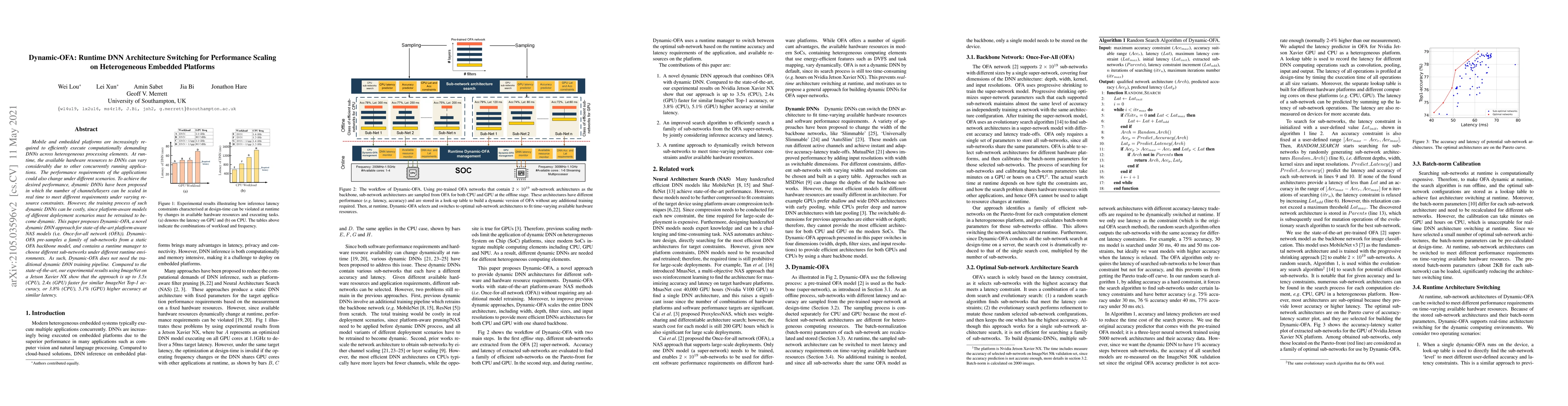 Dynamic-OFA proposes a novel runtime DNN architecture switching method for performance scaling on heterogeneous embedded platforms, pre-sampling sub-networks from a static OFA model to dynamically adapt to varying resource constraints without costly retraining. Experimental results show significant performance gains and accuracy improvements compared to state-of-the-art methods.