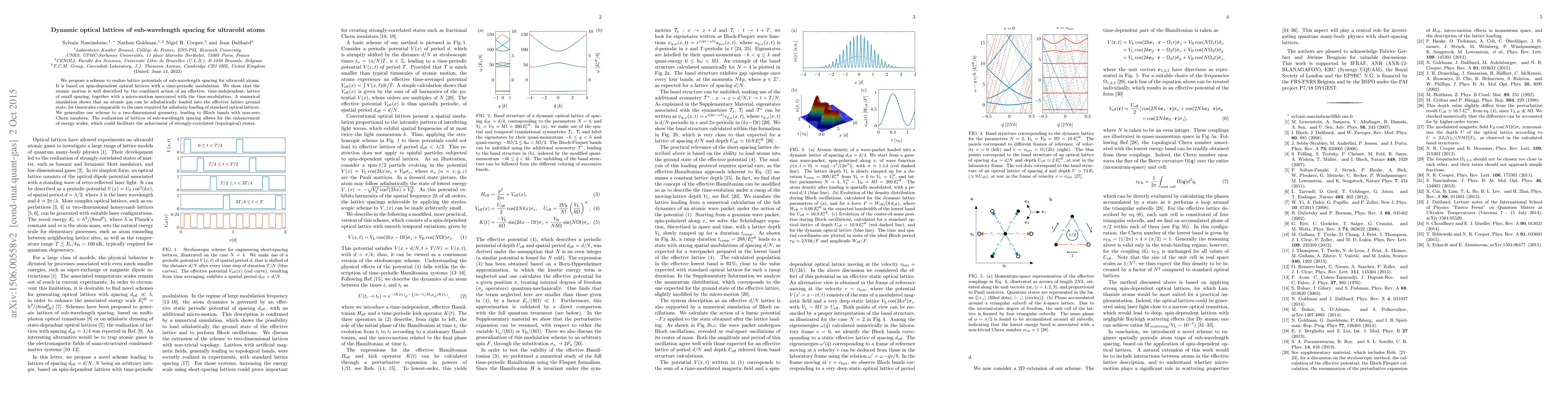 We propose a scheme to realize lattice potentials of sub-wavelength spacing for ultracold atoms. It is based on spin-dependent optical lattices with a time-periodic modulation. We show that the atomic motion is well described by the combined action of an effective, time-independent, lattice of small spacing, together with a micro-motion associated with the time-modulation. A numerical simulation shows that an atomic gas can be adiabatically loaded into the effective lattice ground state, for timescales comparable to the ones required for adiabatic loading of standard optical lattices. We generalize our scheme to a two-dimensional geometry, leading to Bloch bands with non-zero Chern numbers. The realization of lattices of sub-wavelength spacing allows for the enhancement of energy scales, which could facilitate the achievment of strongly-correlated (topological) states.