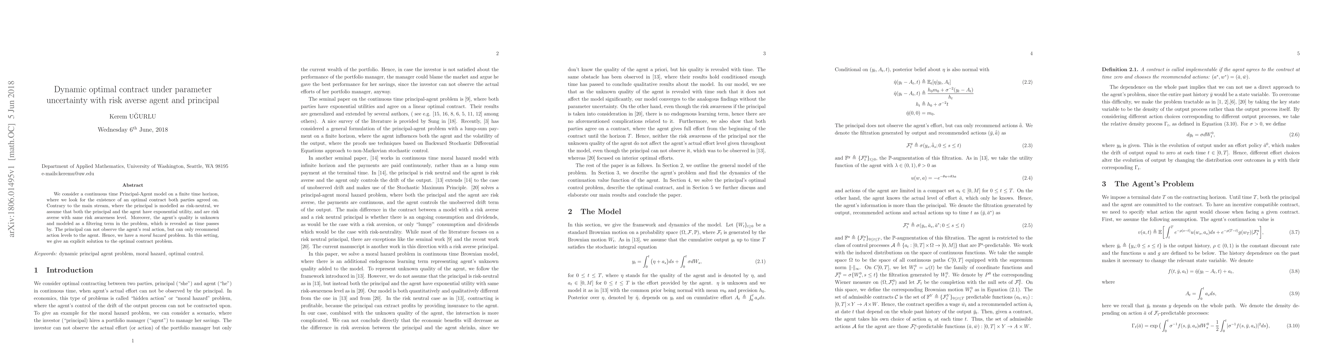 We consider a continuous time Principal-Agent model on a finite time horizon, where we look for the existence of an optimal contract both parties agreed on. Contrary to the main stream, where the principal is modelled as risk-neutral, we assume that both the principal and the agent have exponential utility, and are risk averse with same risk awareness level. Moreover, the agent's quality is unknown and modelled as a filtering term in the problem, which is revealed as time passes by. The principal can not observe the agent's real action, but can only recommend action levels to the agent. Hence, we have a \textit{moral hazard} problem. In this setting, we give an explicit solution to the optimal contract problem.