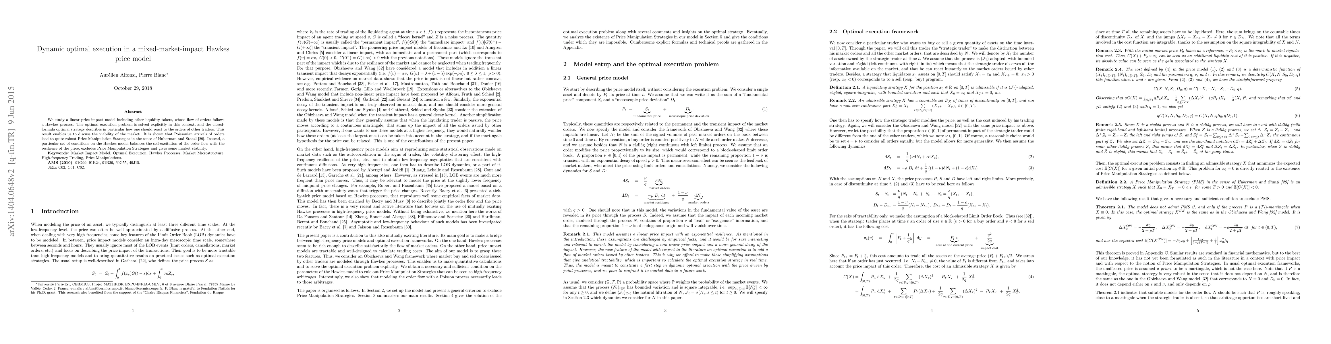 This paper develops a dynamic optimal execution strategy in a mixed-market-impact Hawkes price model, providing a closed-formula for traders to react to other liquidity takers. It finds that while Poissonian order arrivals enable robust price manipulation, specific conditions in the Hawkes model can stabilize the market by balancing order flow self-excitation and price resilience.