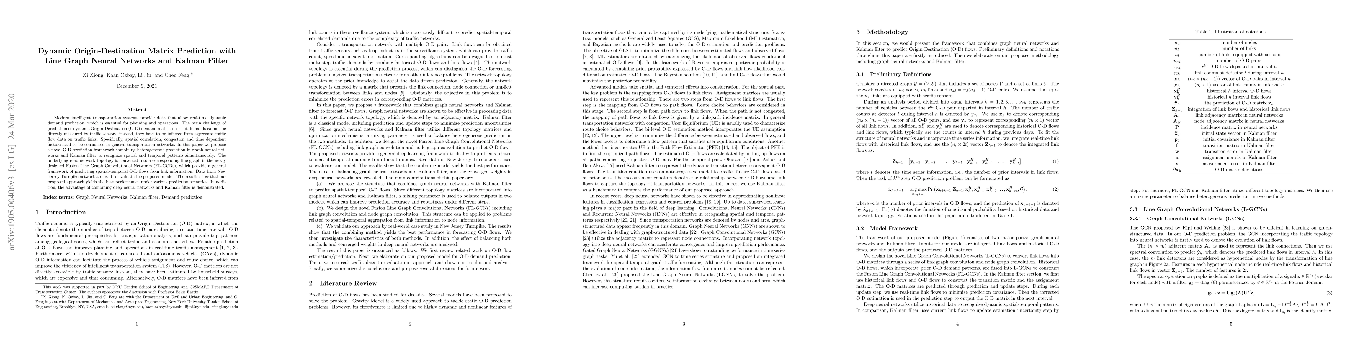 This paper proposes a novel framework for predicting dynamic Origin-Destination matrices using Fusion Line Graph Convolutional Networks and a Kalman filter, achieving superior performance in real-time traffic demand prediction by recognizing spatial and temporal patterns in transportation networks. The model is evaluated using data from the New Jersey Turnpike network.