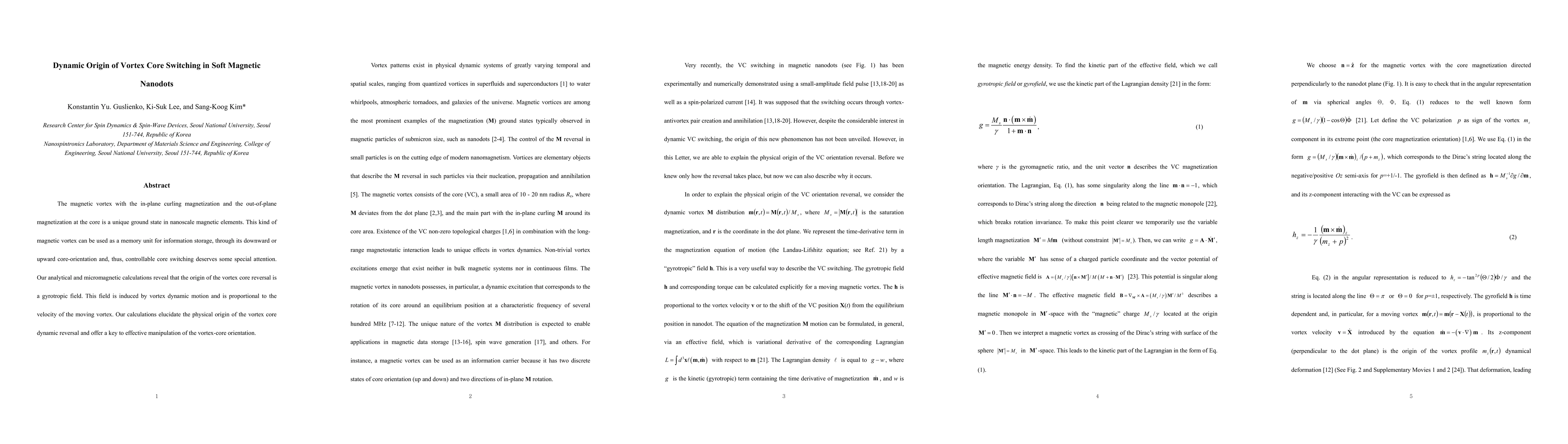This paper investigates the dynamic origin of magnetic vortex core switching in soft magnetic nanodots, revealing that gyrotropic fields induced by vortex motion proportional to its velocity cause the core reversal. The findings provide insight into the physical mechanisms behind vortex core dynamics and suggest methods for effective manipulation of vortex-core orientation.