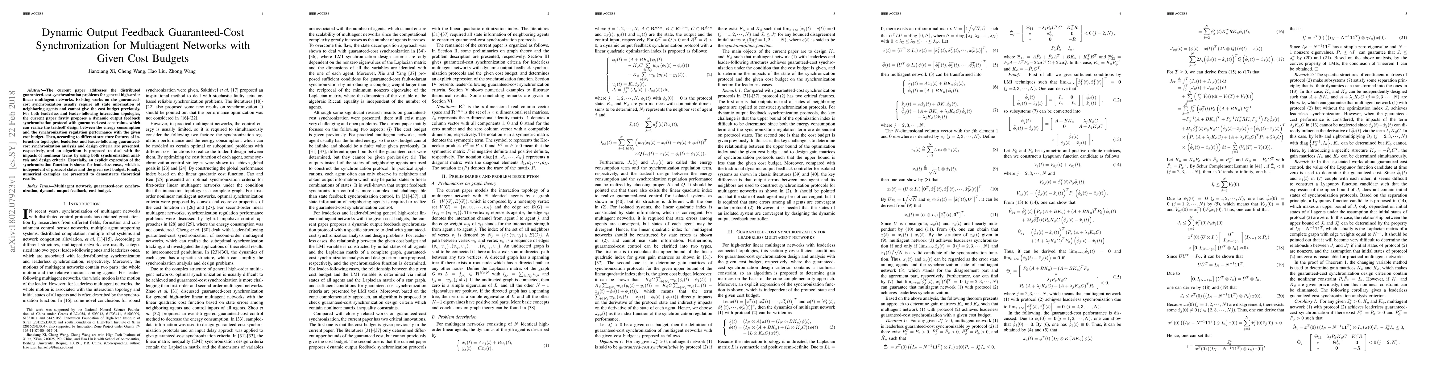 The current paper addresses the distributed guaranteed-cost synchronization problems for general high-order linear multiagent networks. Existing works on the guaranteed-cost synchronization usually require all state information of neighboring agents and cannot give the cost budget previously. For both leaderless and leader-following interaction topologies, the current paper firstly proposes a dynamic output feedback synchronization protocol with guaranteed-cost constraints, which can realize the tradeoff design between the energy consumption and the synchronization regulation performance with the given cost budget. Then, according to different structure features of interaction topologies, leaderless and leader-following guaranteed-cost synchronization analysis and design criteria are presented, respectively, and an algorithm is proposed to deal with the impacts of nonlinear terms by using both synchronization analysis and design criteria. Especially, an explicit expression of the synchronization function is shown for leaderless cases, which is independent of protocol states and the given cost budget. Finally, numerical examples are presented to demonstrate theoretical results.