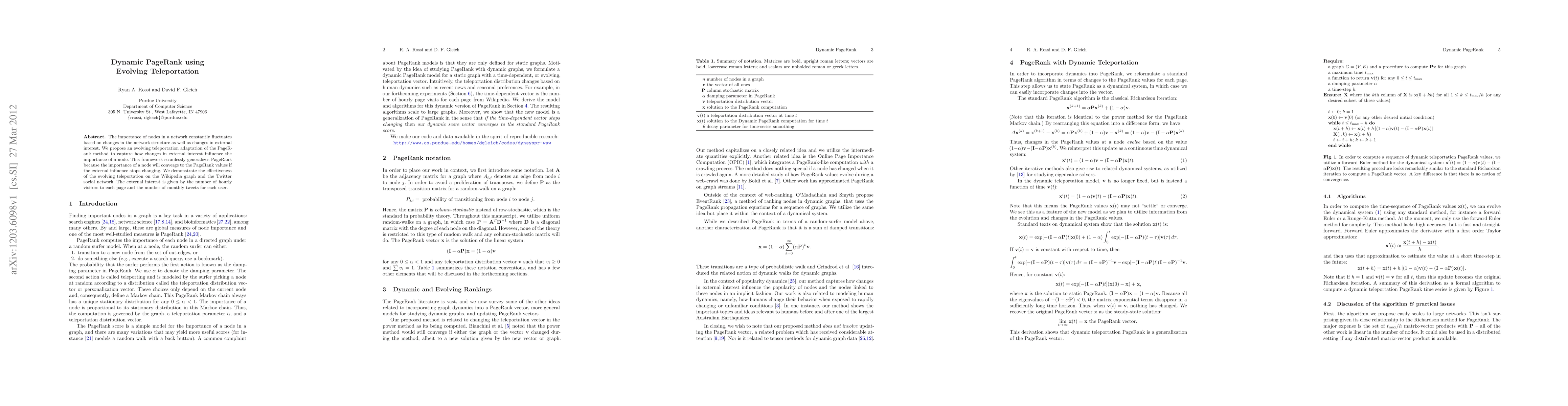 This paper proposes an evolving teleportation adaptation of the PageRank method to dynamically reflect changes in node importance due to network structure shifts and external interest. The framework effectively captures these influences and converges to traditional PageRank values when external influences stabilize, demonstrated through analysis on Wikipedia and Twitter data.