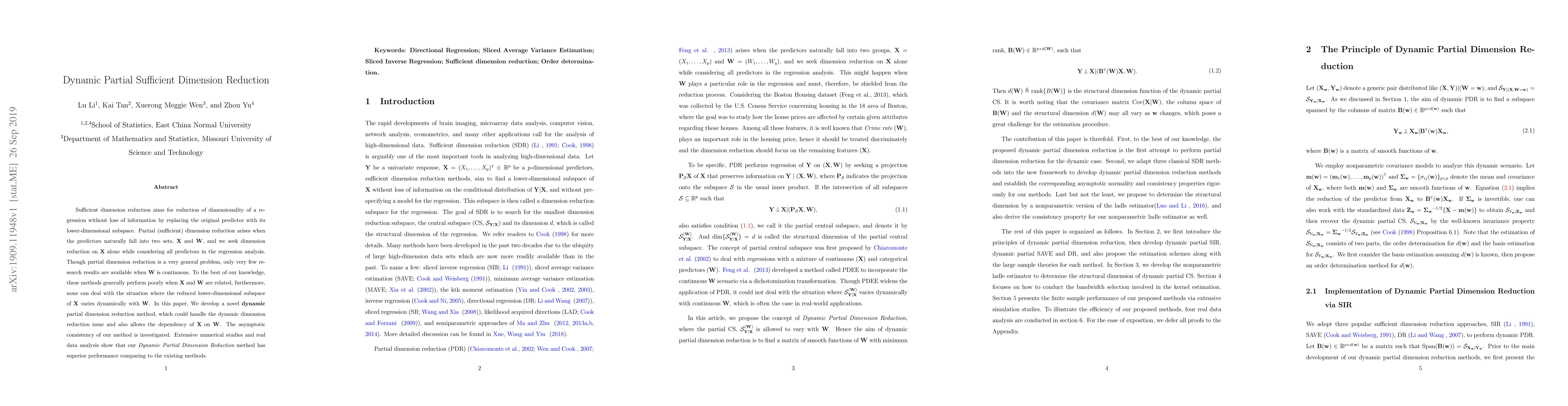 This paper introduces a novel dynamic partial dimension reduction method to handle the varying lower-dimensional subspace of predictors while considering the dependency between predictor sets. The method is shown to outperform existing approaches through extensive numerical studies and real data analysis.