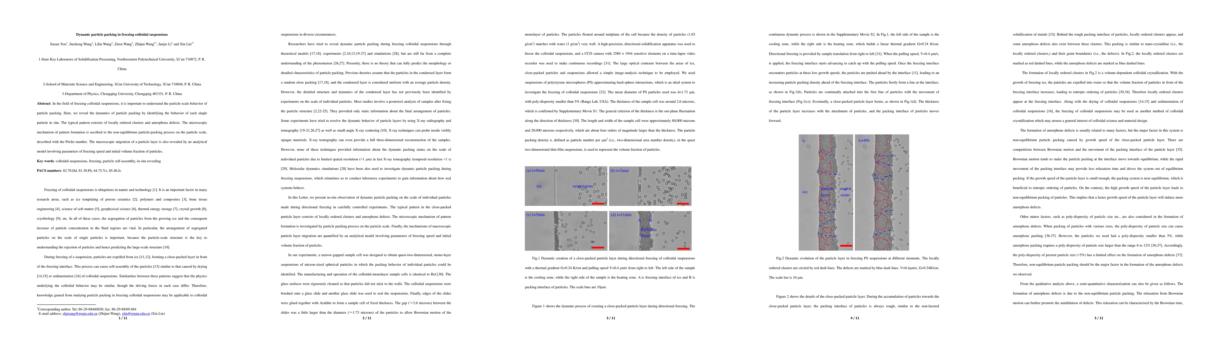 This study investigates the dynamic packing of particles in freezing colloidal suspensions, revealing locally ordered clusters and amorphous defects driven by non-equilibrium processes. An analytical model correlates macroscopic particle layer migration with freezing speed and initial particle volume fraction.