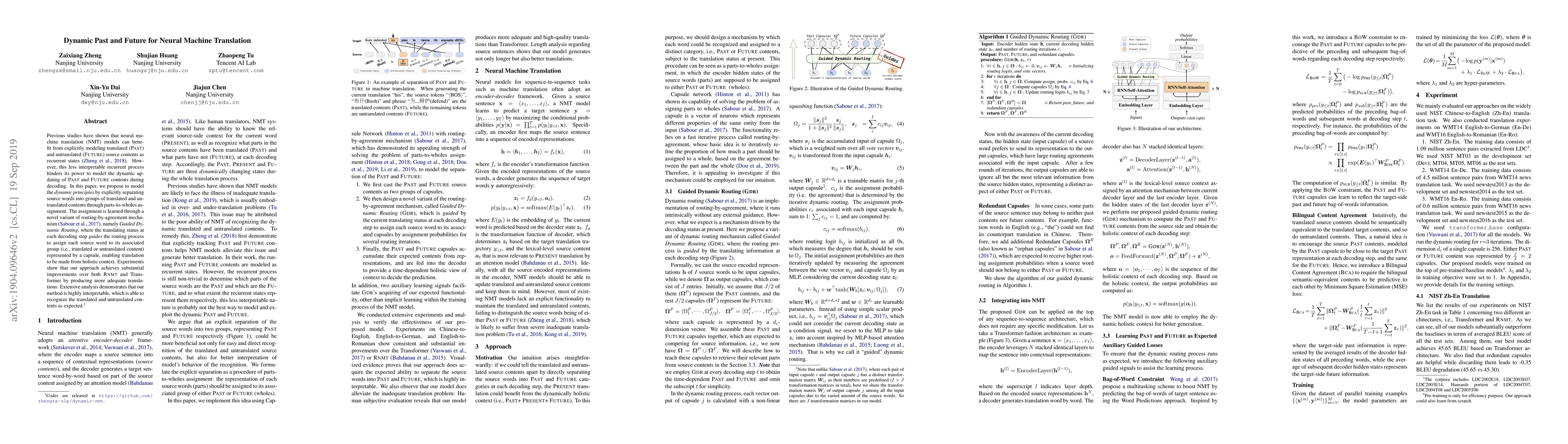 Previous studies have shown that neural machine translation (NMT) models can benefit from explicitly modeling translated (Past) and untranslated (Future) to groups of translated and untranslated contents through parts-to-wholes assignment. The assignment is learned through a novel variant of routing-by-agreement mechanism (Sabour et al., 2017), namely {\em Guided Dynamic Routing}, where the translating status at each decoding step {\em guides} the routing process to assign each source word to its associated group (i.e., translated or untranslated content) represented by a capsule, enabling translation to be made from holistic context. Experiments show that our approach achieves substantial improvements over both RNMT and Transformer by producing more adequate translations. Extensive analysis demonstrates that our method is highly interpretable, which is able to recognize the translated and untranslated contents as expected.