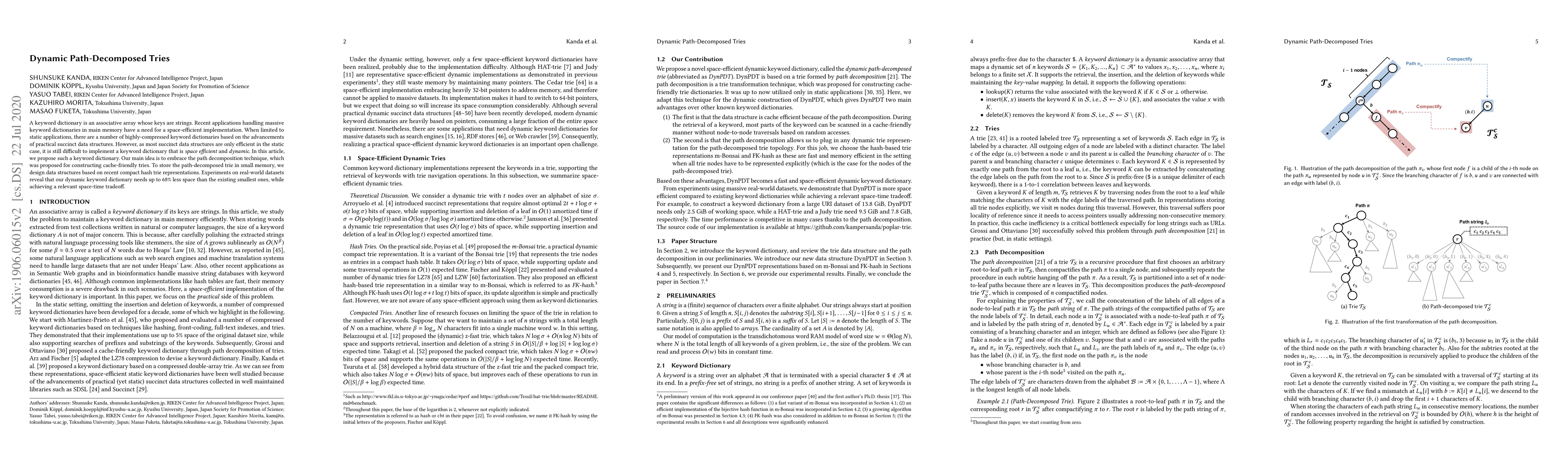 This paper introduces a dynamic keyword dictionary that is both space-efficient and efficient for main-memory use in handling massive datasets. It combines path decomposition and compact hash trie representations, reducing space requirements by up to 68% compared to existing methods, while maintaining a reasonable space-time tradeoff.