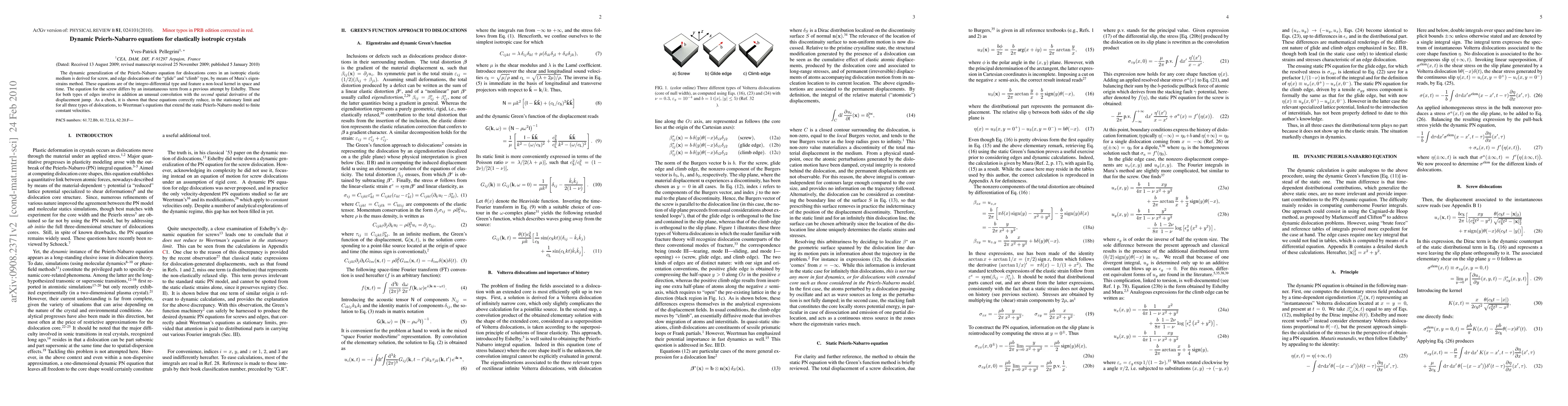 This paper derives dynamic generalizations of the Peierls-Nabarro equations for screw and edge dislocations in elastically isotropic crystals, featuring non-local kernels and convolutions with spatial derivatives. The derived equations reduce to Weertman's static extensions in the stationary limit.