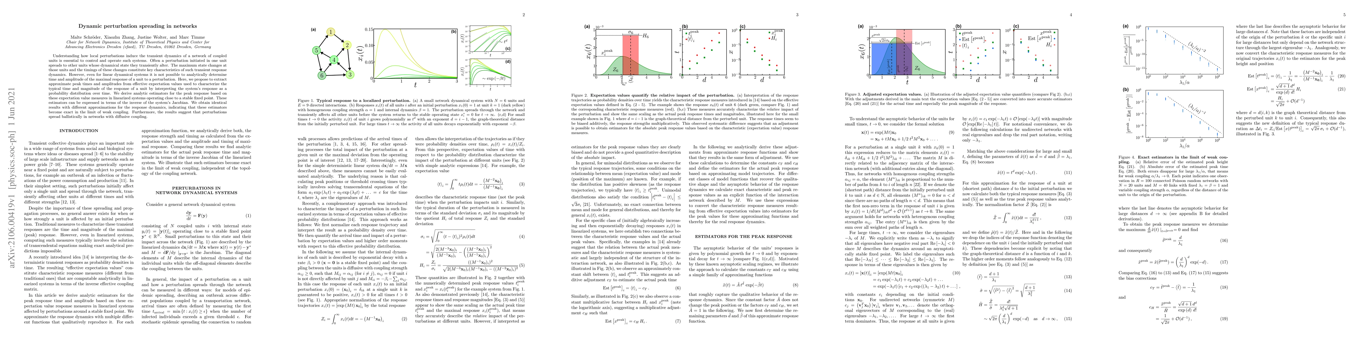 Researchers developed a method to estimate peak response times and amplitudes in networks with perturbations, finding that these spreads ballistically in diffusive coupling systems.