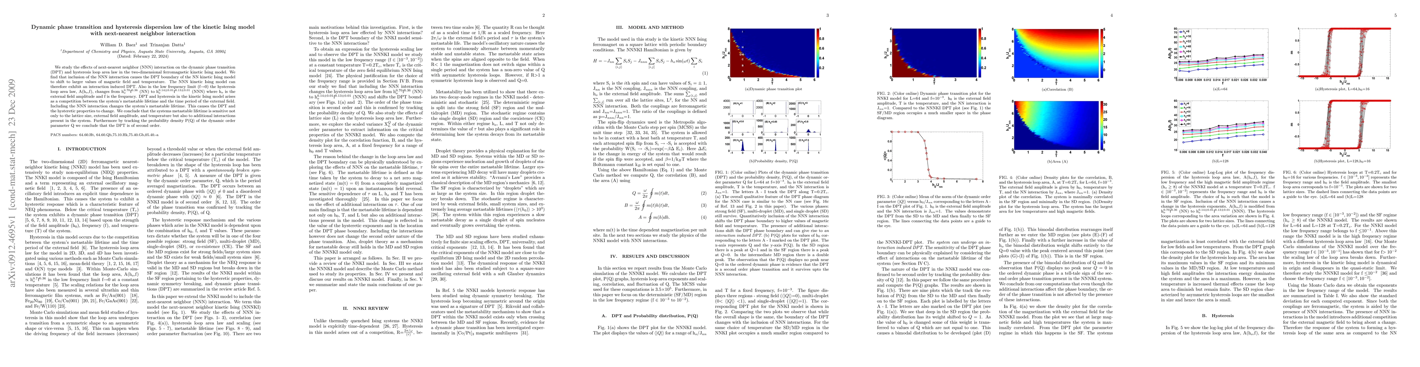We study the effects of next-nearest neighbor (NNN) interaction on the dynamic phase transition (DPT) and hysteresis loop area law in the two-dimensional ferromagnetic kinetic Ising model. We find that inclusion of the NNN interaction causes the DPT boundary of the NN kinetic Ising model to shift to larger values of magnetic field and temperature. The NNN kinetic Ising model can therefore exhibit an interaction induced DPT. Also in the low frequency limit (f$\to$0) the hysteresis loop area law, A(h$_{o}$,f), changes from h$^{0.70}_{o}$f$^{0.36}$ (NN) to h$^{0.14\pm 0.01}_{o}$f$^{0.13\pm0.01}$ (NNN) where h$_o$ is the external field amplitude and f is the frequency. DPT and hysteresis in the kinetic Ising model arises as a competition between the system's metastable lifetime and the time period of the external field. Including the NNN interaction changes the system's metastable lifetime. This causes the DPT and the hysteretic properties to change. We conclude that the systems metastable lifetime is sensitive not only to the lattice size, external field amplitude, and temperature but also to additional interactions present in the system. Furthermore by tracking the probability density P(Q) of the dynamic order parameter Q we conclude that the DPT is of second order.
