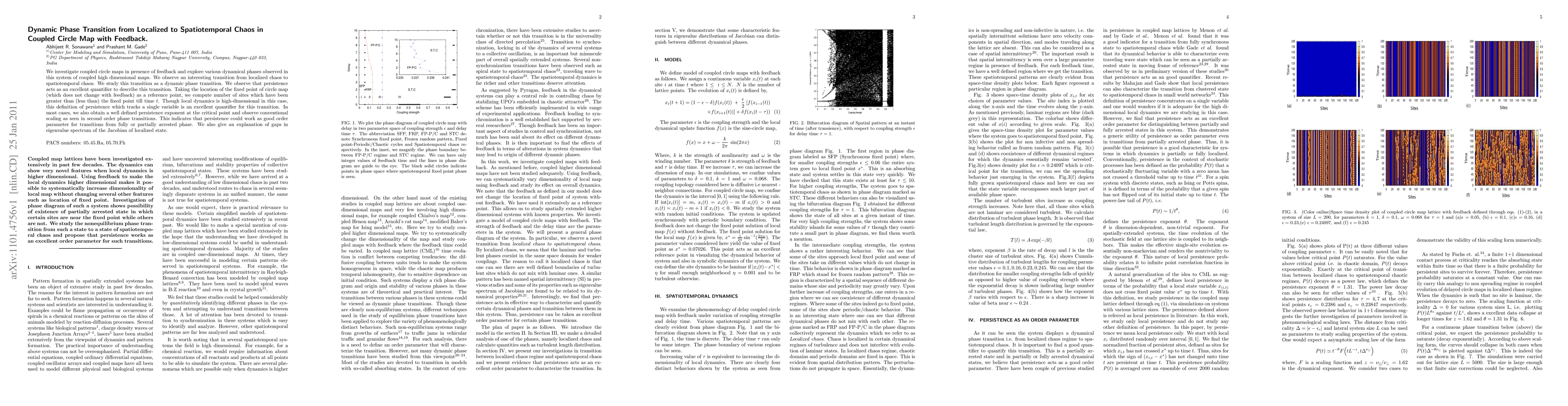 This paper explores the dynamic phase transition from localized to spatiotemporal chaos in coupled circle maps with feedback, using persistence as a key quantifier. It identifies a well-defined persistence exponent at the critical point, indicating conventional scaling akin to second-order phase transitions.