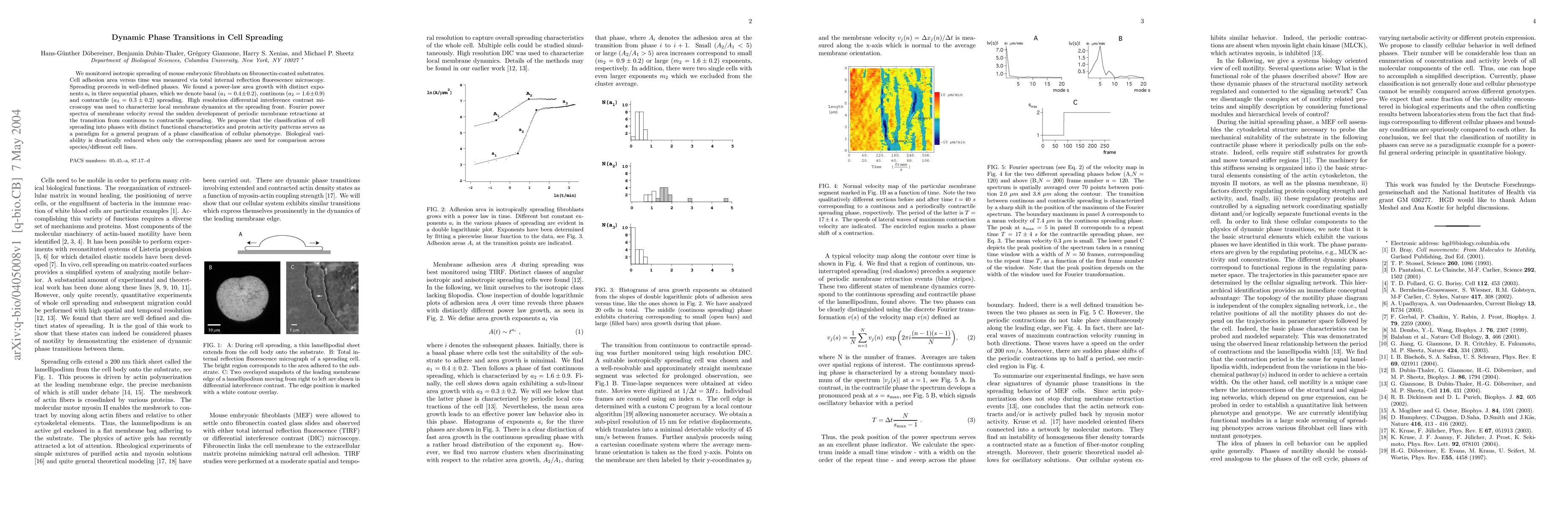 We monitored isotropic spreading of mouse embryonic fibroblasts on fibronectin-coated substrates. Cell adhesion area versus time was measured via total internal reflection fluorescence microscopy. Spreading proceeds in well-defined phases. We found a power-law area growth with distinct exponents a_i in three sequential phases, which we denote basal (a_1=0.4+-0.2), continous (a_2=1.6+-0.9) and contractile (a_3=0.3+-0.2) spreading. High resolution differential interference contrast microscopy was used to characterize local membrane dynamics at the spreading front. Fourier power spectra of membrane velocity reveal the sudden development of periodic membrane retractions at the transition from continous to contractile spreading. We propose that the classification of cell spreading into phases with distinct functional characteristics and protein activity patterns serves as a paradigm for a general program of a phase classification of cellular phenotype. Biological variability is drastically reduced when only the corresponding phases are used for comparison across species/different cell lines.