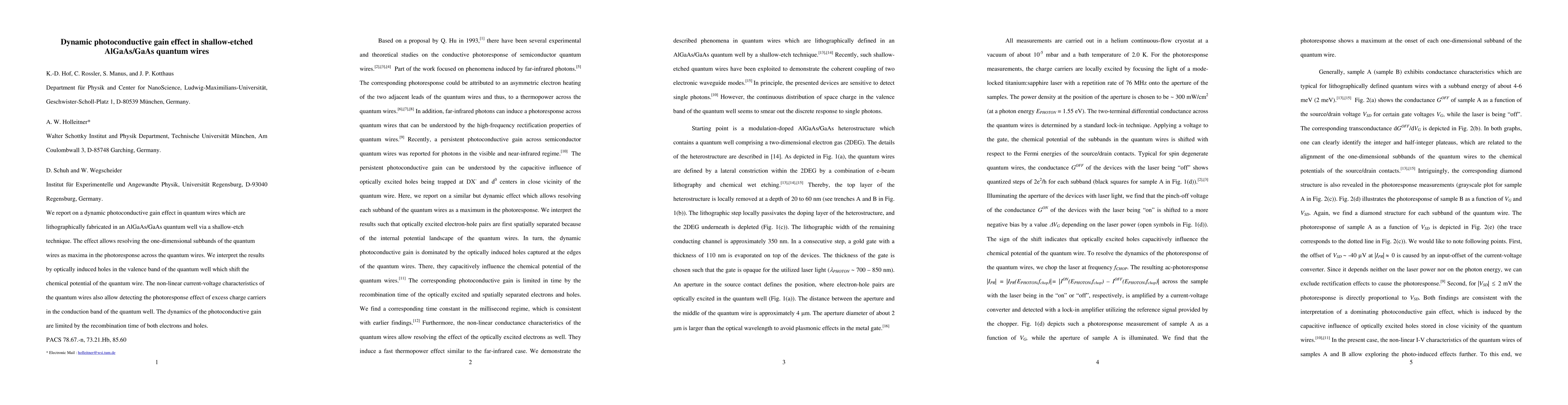 This paper investigates the dynamic photoconductive gain effect in shallow-etched AlGaAs/GaAs quantum wires, revealing one-dimensional subbands through photoresponse maxima. The effect is attributed to optically induced holes shifting the quantum wire's chemical potential, with dynamics constrained by recombination times of electrons and holes.
