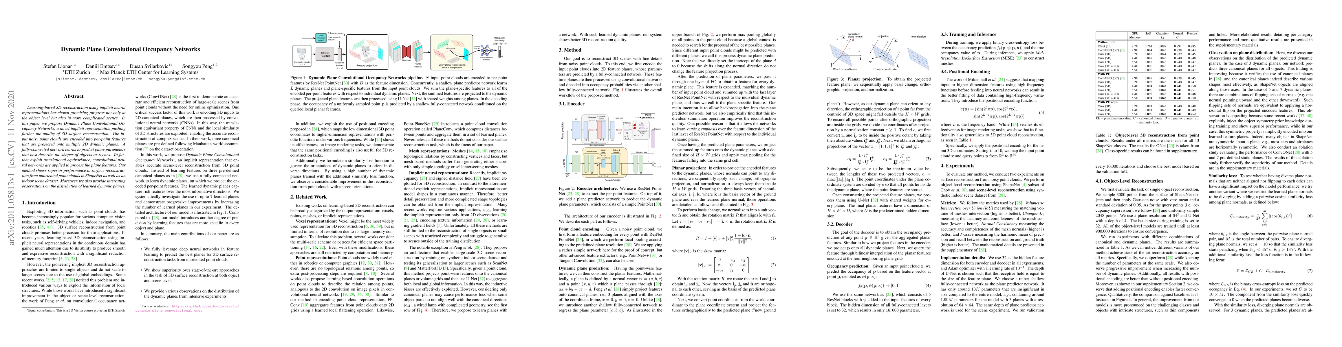 This paper proposes Dynamic Plane Convolutional Occupancy Networks for high-quality 3D surface reconstruction from noisy point clouds. The method projects point features onto dynamic planes, with a network predicting plane parameters to describe object shapes, leveraging convolutional networks for translational equivariance.