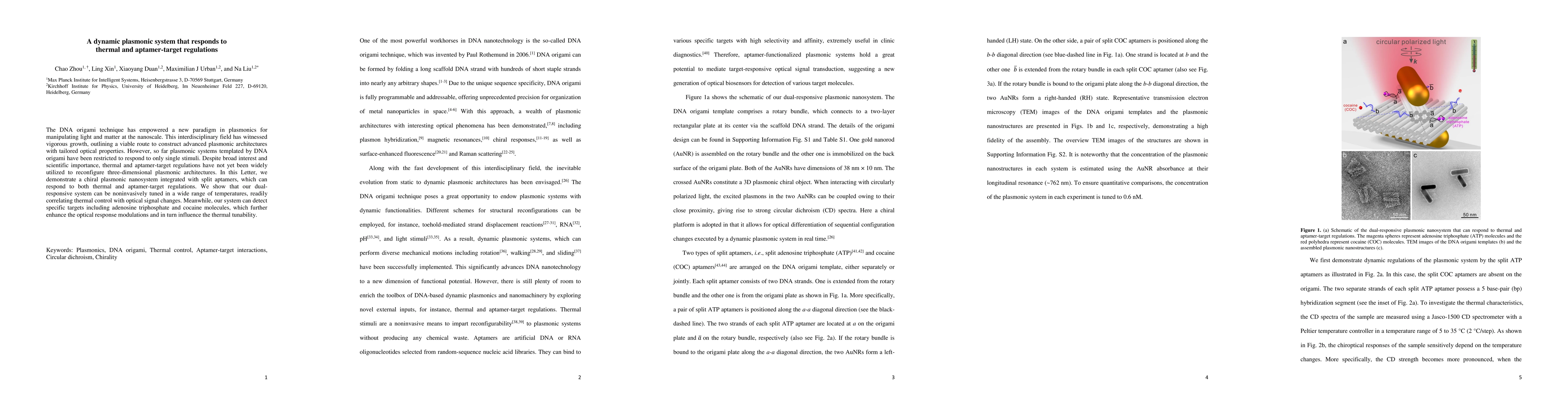 A new plasmonic system that responds to both temperature and aptamer-target regulations has been developed using DNA origami technology, enabling non-invasive tuning and detection of specific molecules.