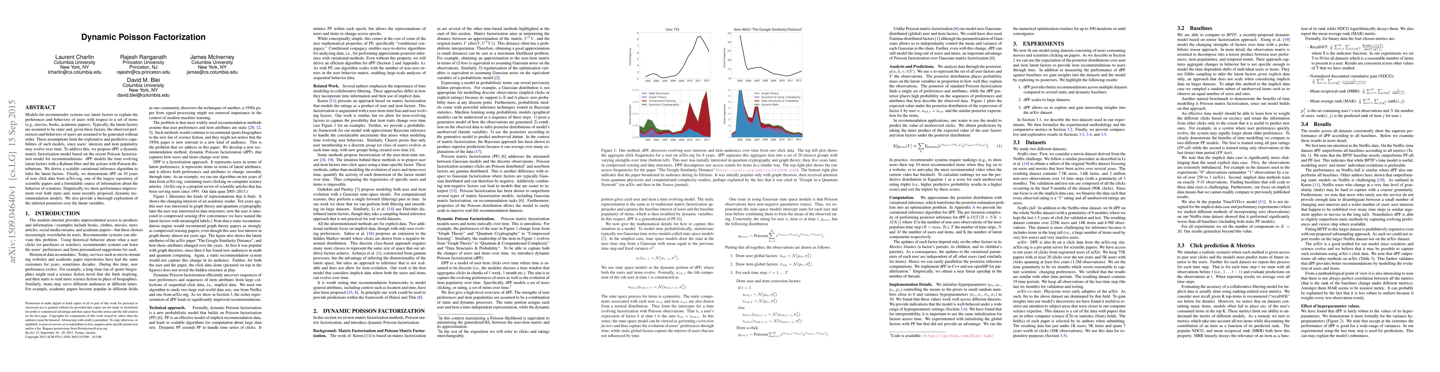 The paper proposes dPF, a dynamic matrix factorization model that uses a Kalman filter to model time-evolving latent factors and Poisson distributions for user actions, improving recommender system performance over static and other dynamic models, demonstrated through 10 years of arXiv.org user click data.