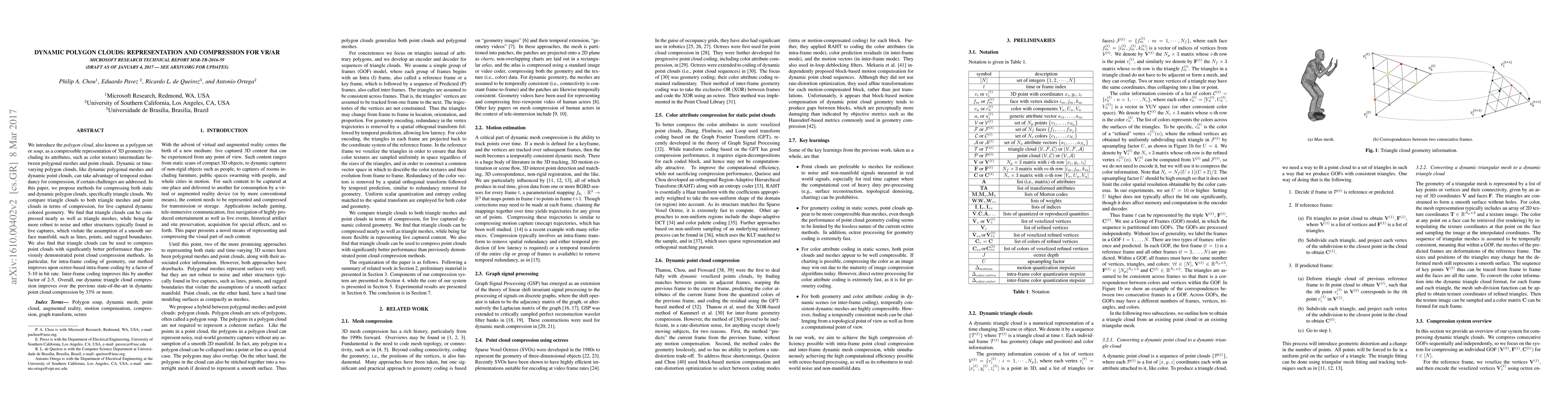 This paper proposes methods for compressing static and dynamic polygon clouds, specifically triangle clouds, which offer a robust alternative to triangle meshes and point clouds for representing 3D geometry. The triangle cloud approach significantly outperforms previous point cloud compression methods, achieving a 33% improvement over the state-of-the-art in dynamic point cloud compression.
