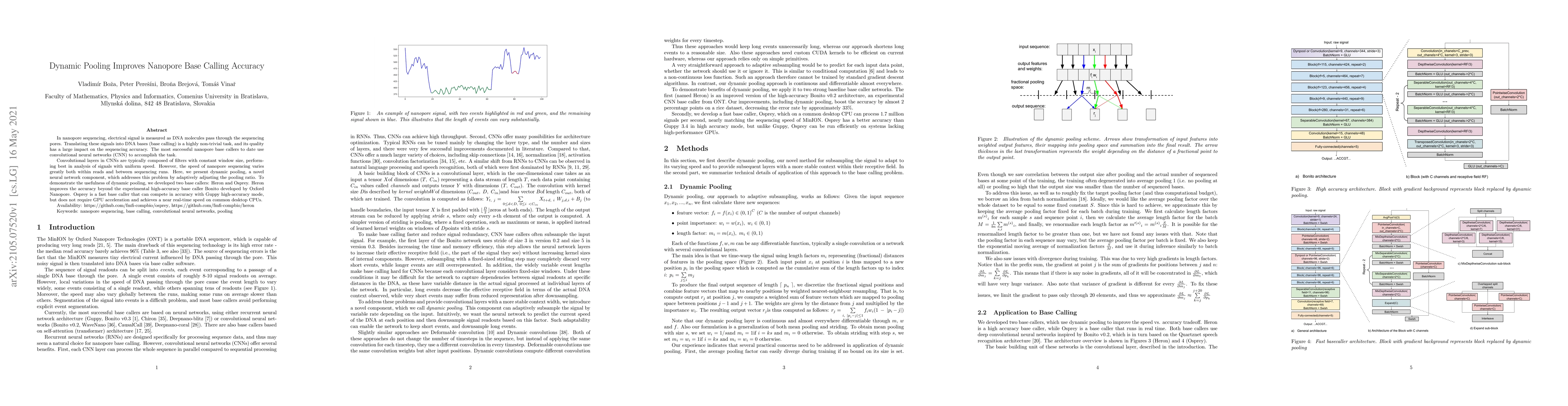 This research introduces dynamic pooling, a novel neural network component designed to enhance the accuracy of base calling in nanopore sequencing. By adaptively adjusting the pooling ratio, dynamic pooling addresses the variability in sequencing speed, leading to improved base callers Heron and Osprey that outperform existing methods in accuracy and speed. For more details, visit the project repositories at the provided links.