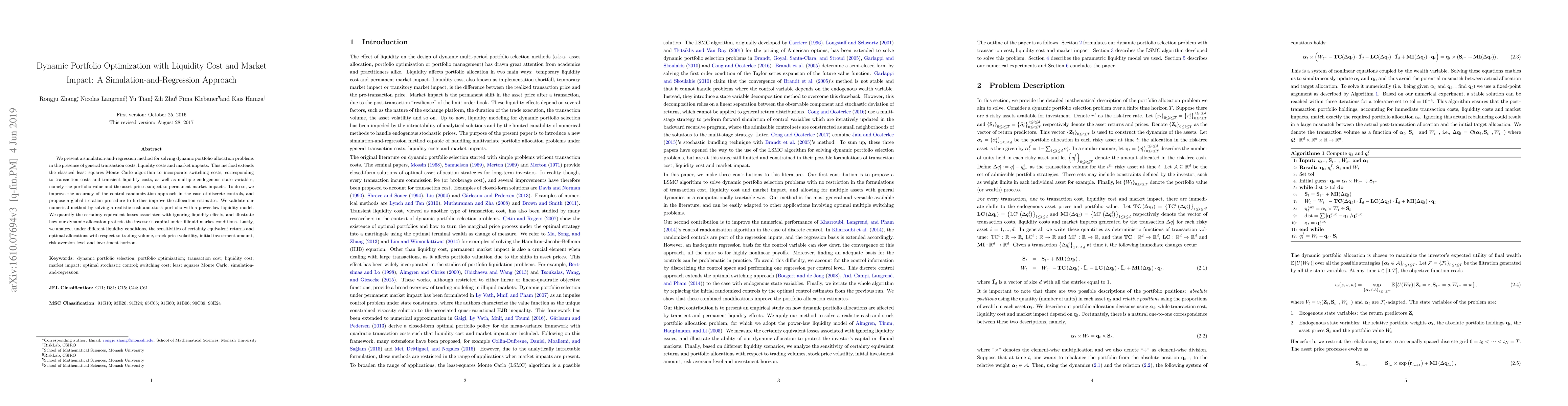 This paper introduces a simulation-and-regression method for dynamic portfolio optimization that accounts for liquidity costs and market impacts, improving accuracy through control randomization and global iteration procedures. The method is validated through a realistic cash-and-stock portfolio scenario, demonstrating the benefits of considering liquidity effects in portfolio management.