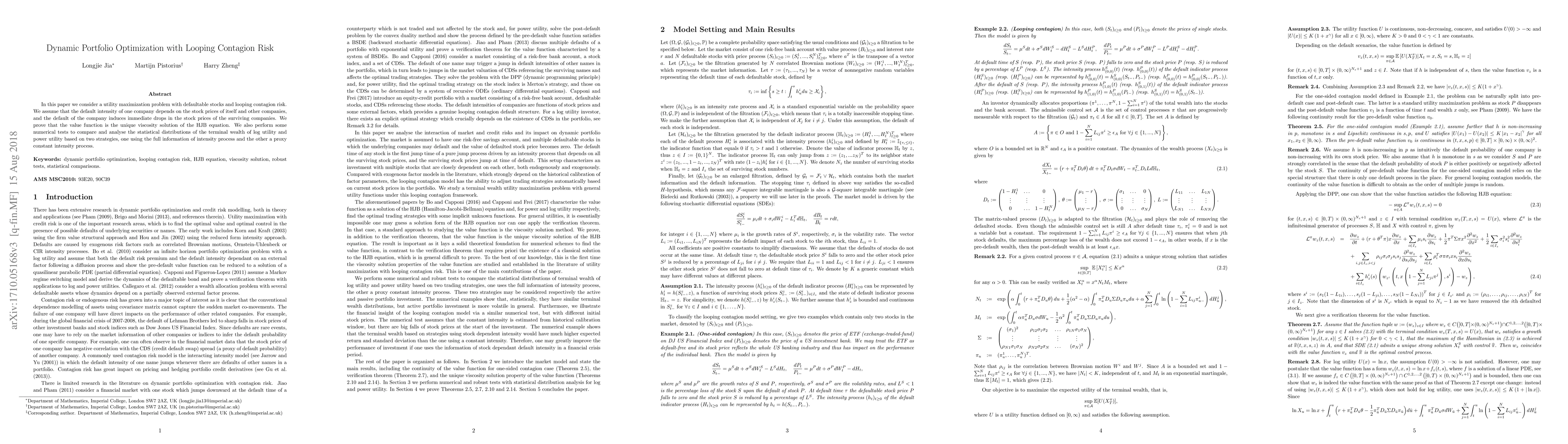 This paper explores utility maximization in dynamic portfolio optimization under defaultable stocks and looping contagion risk, proving the value function as a unique viscosity solution to the HJB equation. Numerical tests compare terminal wealth distributions of log utility and power utility strategies using full and proxy intensity processes.