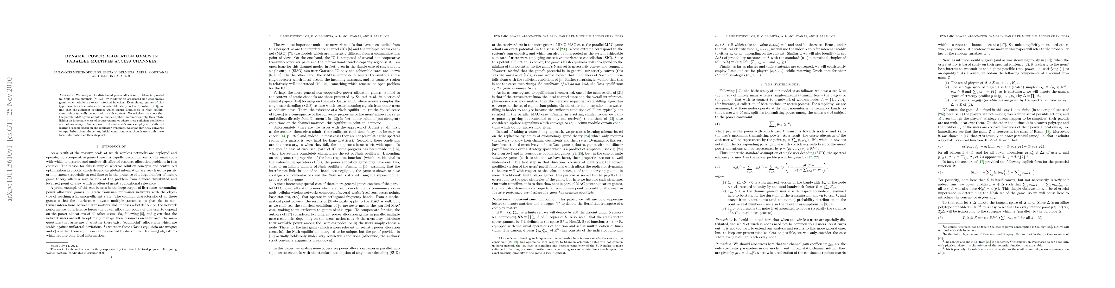 We analyze the distributed power allocation problem in parallel multiple access channels (MAC) by studying an associated non-cooperative game which admits an exact potential. Even though games of this type have been the subject of considerable study in the literature, we find that the sufficient conditions which ensure uniqueness of Nash equilibrium points typically do not hold in this context. Nonetheless, we show that the parallel MAC game admits a unique equilibrium almost surely, thus establishing an important class of counterexamples where these sufficient conditions are not necessary. Furthermore, if the network's users employ a distributed learning scheme based on the replicator dynamics, we show that they converge to equilibrium from almost any initial condition, even though users only have local information at their disposal.