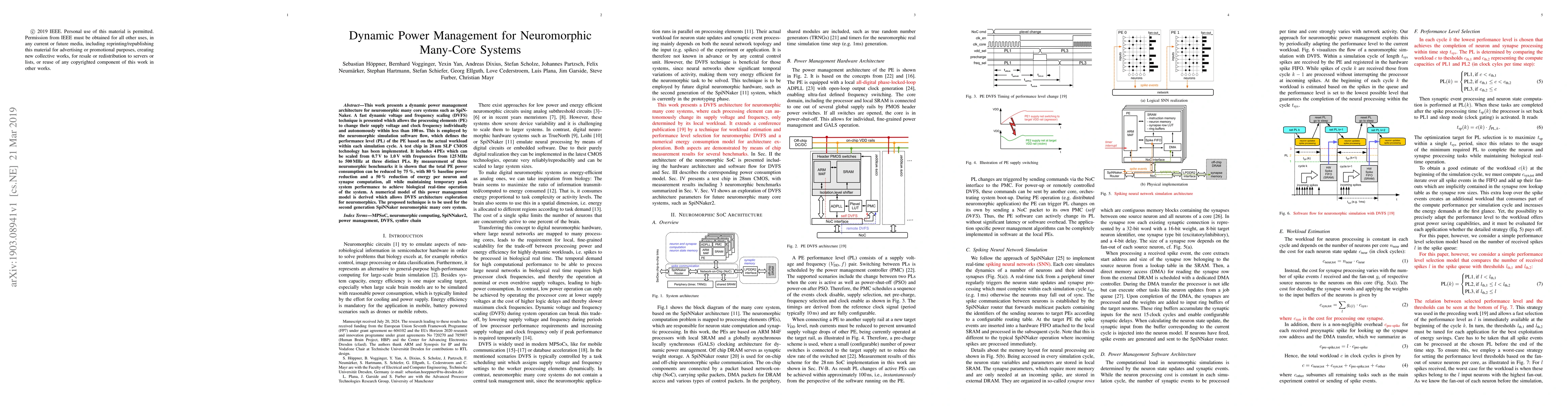 This work presents a dynamic power management architecture for neuromorphic many core systems such as SpiNNaker. A fast dynamic voltage and frequency scaling (DVFS) technique is presented which allows the processing elements (PE) to change their supply voltage and clock frequency individually and autonomously within less than 100 ns. This is employed by the neuromorphic simulation software flow, which defines the performance level (PL) of the PE based on the actual workload within each simulation cycle. A test chip in 28 nm SLP CMOS technology has been implemented. It includes 4 PEs which can be scaled from 0.7 V to 1.0 V with frequencies from 125 MHz to 500 MHz at three distinct PLs. By measurement of three neuromorphic benchmarks it is shown that the total PE power consumption can be reduced by 75%, with 80% baseline power reduction and a 50% reduction of energy per neuron and synapse computation, all while maintaining temporary peak system performance to achieve biological real-time operation of the system. A numerical model of this power management model is derived which allows DVFS architecture exploration for neuromorphics. The proposed technique is to be used for the second generation SpiNNaker neuromorphic many core system.