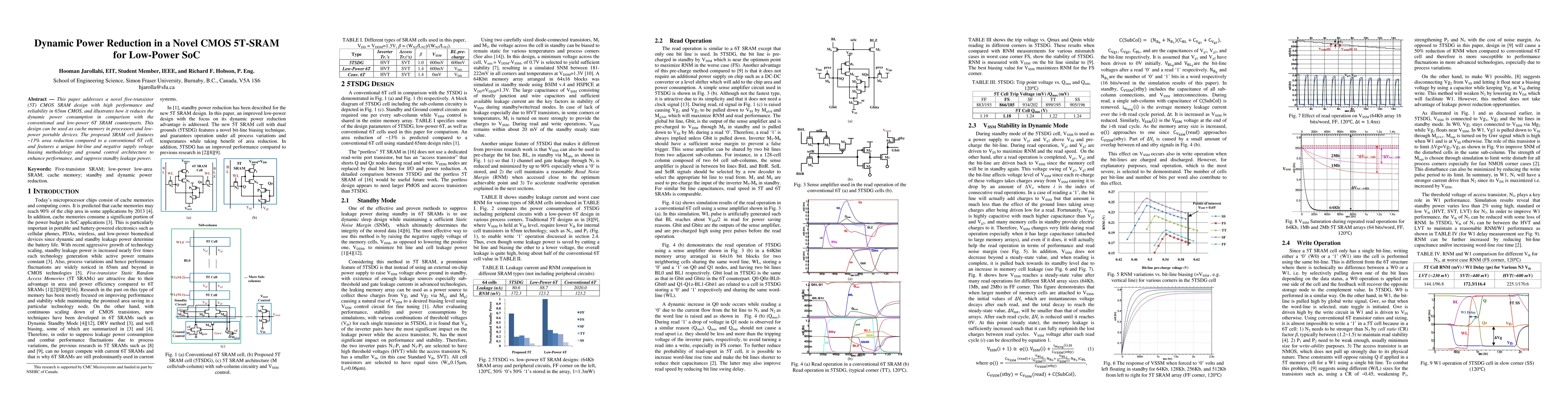This paper presents a novel five-transistor (5T) CMOS SRAM design that achieves significant dynamic power reduction and ~13% area reduction compared to conventional 6T SRAM, utilizing unique bit-line and negative supply voltage biasing to enhance performance and suppress leakage power.