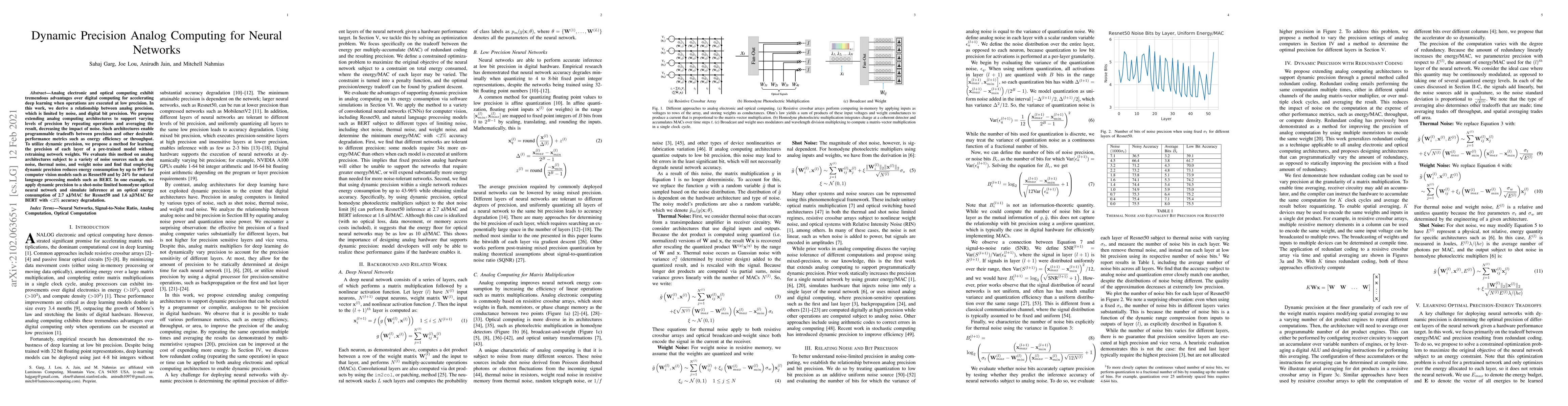 This paper proposes dynamic precision analog computing for neural networks, demonstrating how varying analog precision can optimize performance metrics like energy efficiency. It introduces a method to adjust precision without retraining, achieving up to 89% energy reduction in computer vision models and 24% in NLP models, while maintaining accuracy.