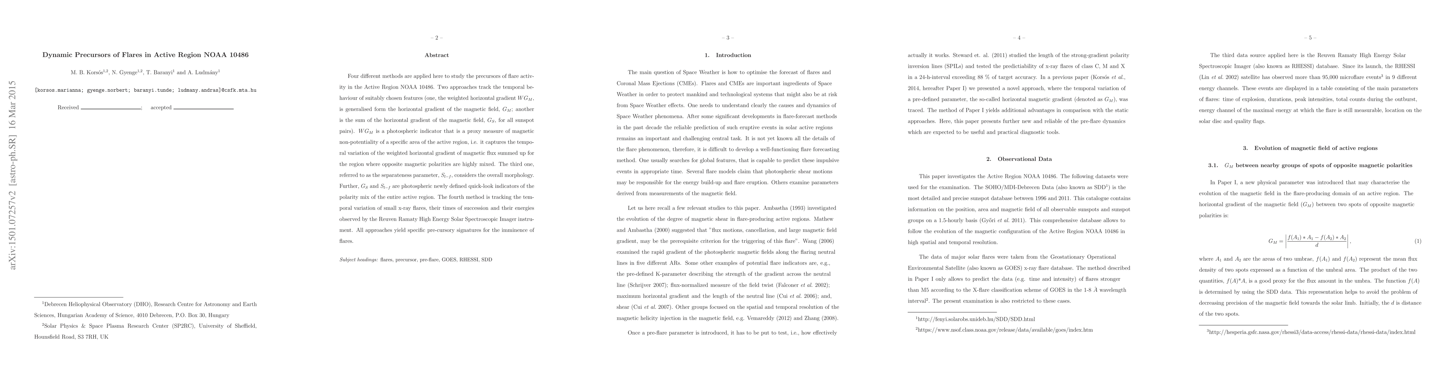 This paper employs four methods to identify precursors of flare activity in Active Region NOAA 10486, including tracking the weighted horizontal gradient of magnetic flux and the sum of horizontal gradient of magnetic field for sunspot pairs, the separateness parameter, and the temporal variation of small x-ray flares. Each method reveals distinct pre-flare signatures.