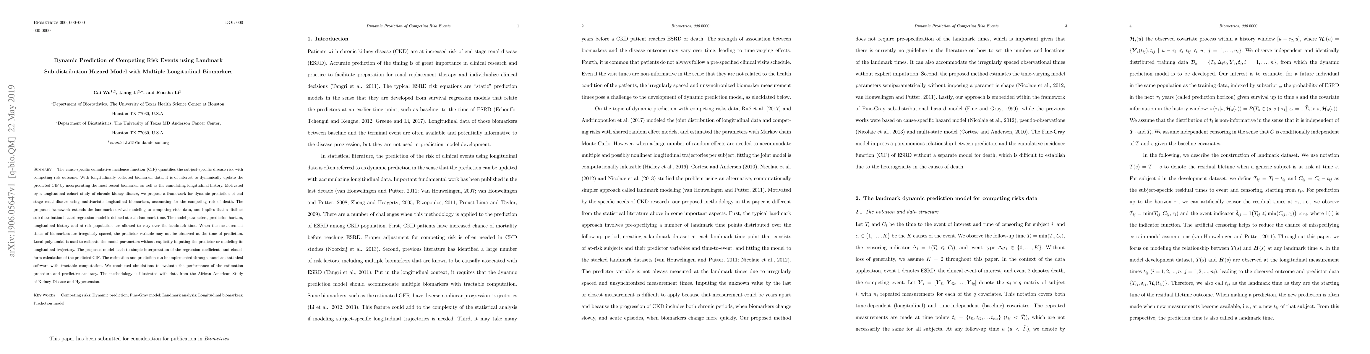 This paper proposes a dynamic prediction framework for competing risk events using a landmark sub-distribution hazard model with multivariate longitudinal biomarkers. It allows for the updating of predicted cumulative incidence functions by incorporating the most recent biomarker data and longitudinal history, illustrated through a chronic kidney disease study.