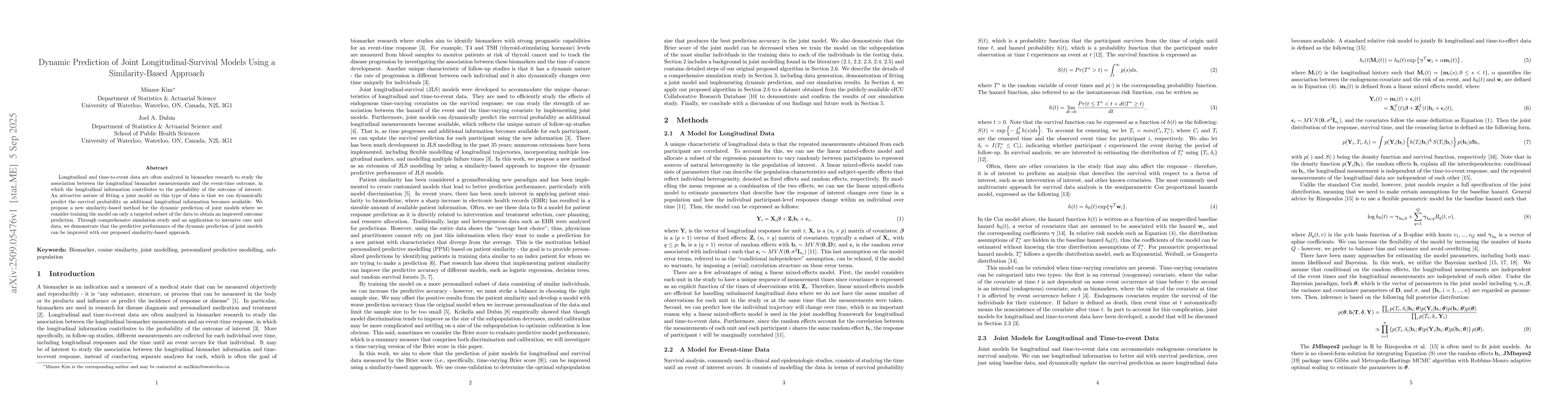 Longitudinal and time-to-event data are often analyzed in biomarker research to study the association between the longitudinal biomarker measurements and the event-time outcome, in which the longitudinal information contributes to the probability of the outcome of interest. An attractive nature of fitting a joint model on this type of data is that we can dynamically predict the survival probability as additional longitudinal information becomes available. We propose a new similarity-based method for the dynamic prediction of joint models where we consider training the model on only a targeted subset of the data to obtain an improved outcome prediction. Through comprehensive simulation study and an application to intensive care unit data, we demonstrate that the predictive performance of the dynamic prediction of joint models can be improved with our proposed similarity-based approach.