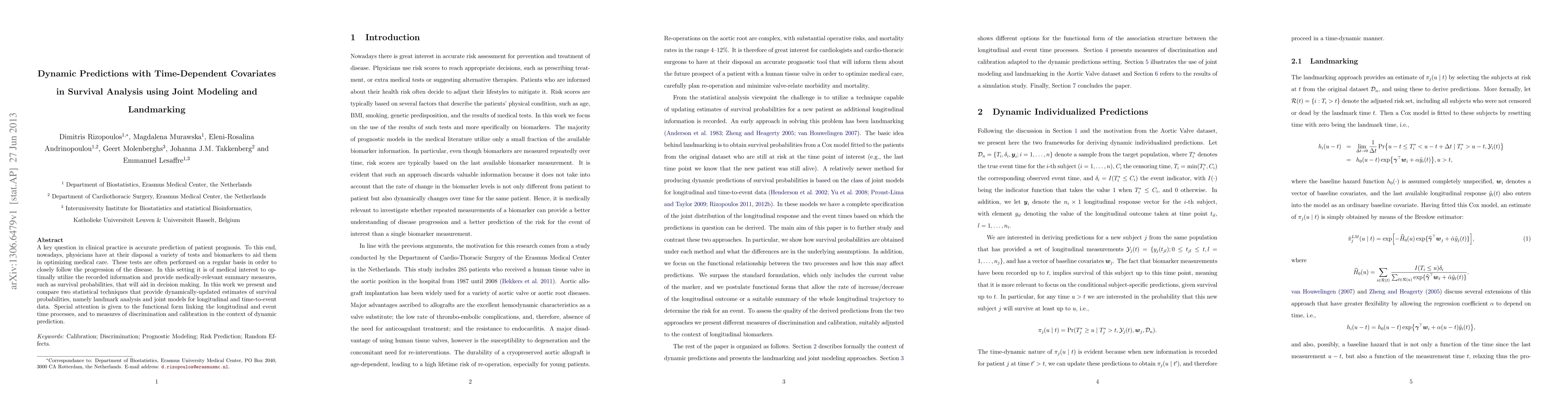 This paper compares landmark analysis and joint modeling techniques for dynamically updating survival probabilities in clinical settings, focusing on the integration of time-dependent covariates and the evaluation of prediction accuracy through discrimination and calibration measures.