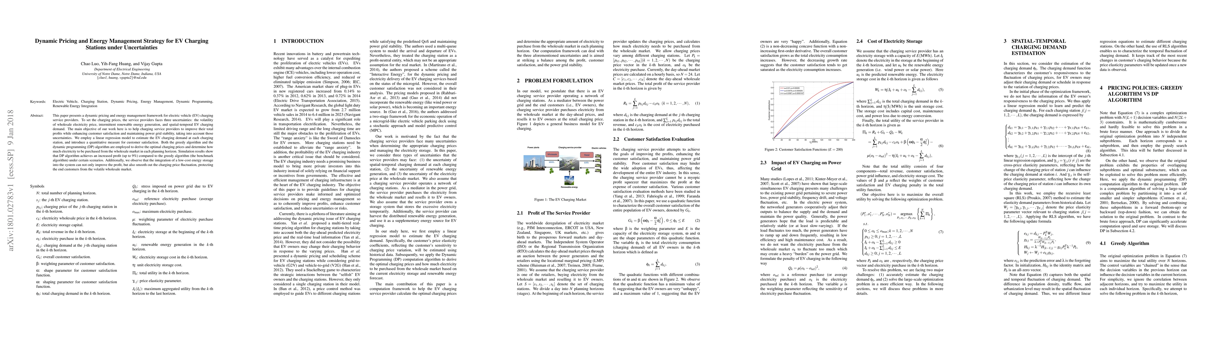 This paper presents a dynamic pricing and energy management framework for electric vehicle (EV) charging service providers. To set the charging prices, the service providers faces three uncertainties: the volatility of wholesale electricity price, intermittent renewable energy generation, and spatial-temporal EV charging demand. The main objective of our work here is to help charging service providers to improve their total profits while enhancing customer satisfaction and maintaining power grid stability, taking into account those uncertainties. We employ a linear regression model to estimate the EV charging demand at each charging station, and introduce a quantitative measure for customer satisfaction. Both the greedy algorithm and the dynamic programming (DP) algorithm are employed to derive the optimal charging prices and determine how much electricity to be purchased from the wholesale market in each planning horizon. Simulation results show that DP algorithm achieves an increased profit (up to 9%) compared to the greedy algorithm (the benchmark algorithm) under certain scenarios. Additionally, we observe that the integration of a low-cost energy storage into the system can not only improve the profit, but also smooth out the charging price fluctuation, protecting the end customers from the volatile wholesale market.