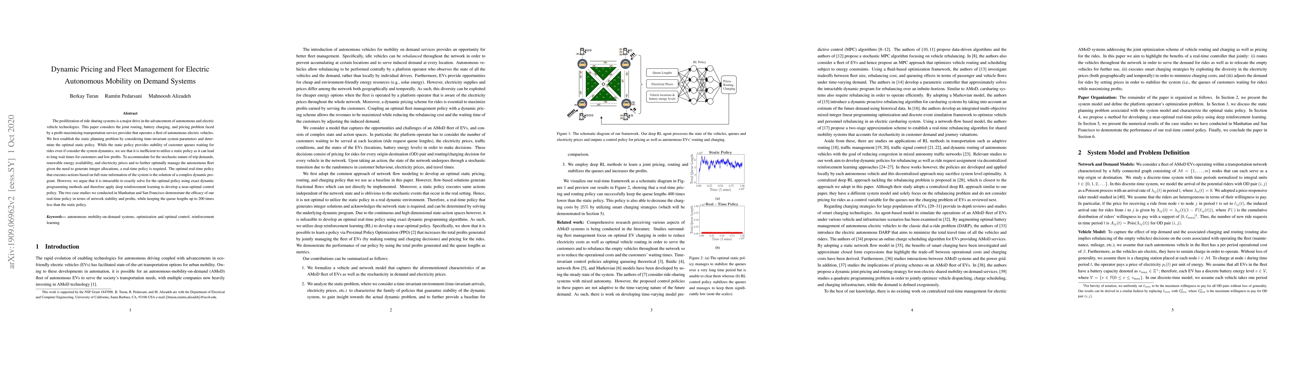 This paper explores dynamic pricing and fleet management for electric autonomous ride-sharing systems, proposing a real-time policy using deep reinforcement learning to optimize fleet operations, battery charging, and pricing, achieving significant reductions in wait times and improved profits compared to static policies. The approach is validated through case studies in Manhattan and San Francisco.