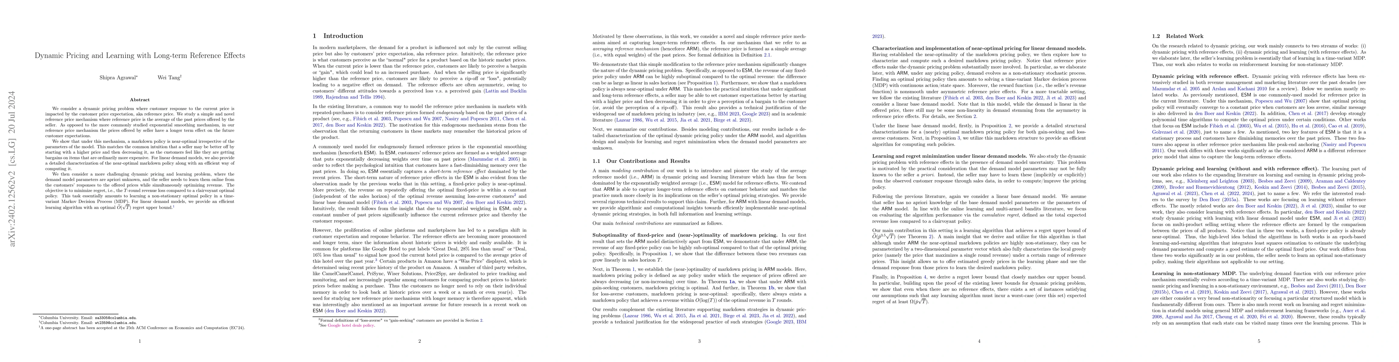 This paper explores dynamic pricing strategies influenced by long-term reference price effects, showing that a markdown policy is near-optimal. It introduces a novel reference price mechanism that averages past prices, contrasting with exponential smoothing. The study also addresses the challenge of learning demand model parameters online while optimizing revenue, providing an efficient algorithm with optimal regret bounds for linear demand models.