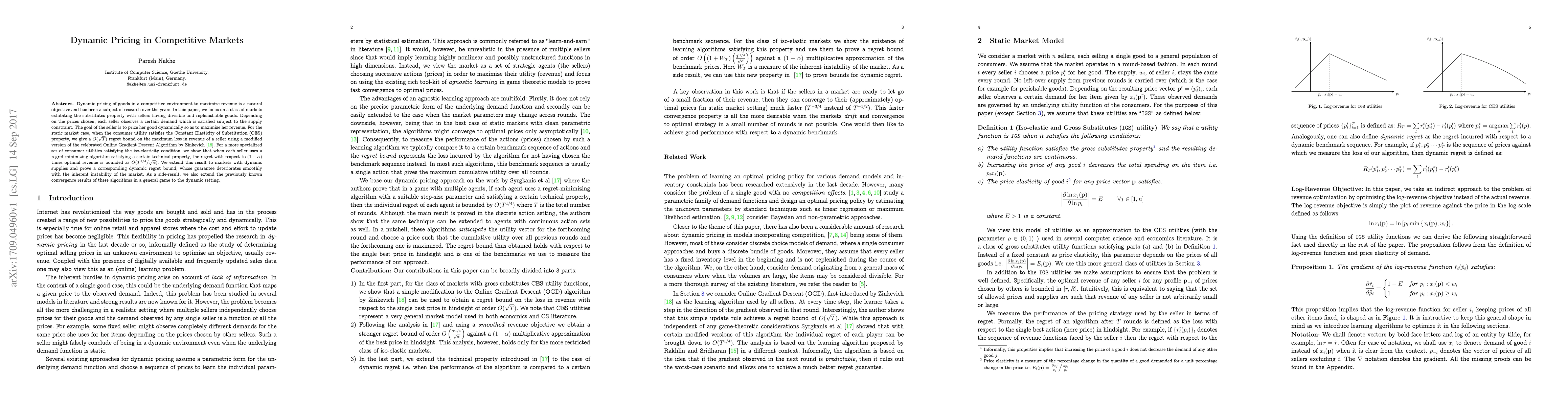 Dynamic pricing of goods in a competitive environment to maximize revenue is a natural objective and has been a subject of research over the years. In this paper, we focus on a class of markets exhibiting the substitutes property with sellers having divisible and replenishable goods. Depending on the prices chosen, each seller observes a certain demand which is satisfied subject to the supply constraint. The goal of the seller is to price her good dynamically so as to maximize her revenue. For the static market case, when the consumer utility satisfies the Constant Elasticity of Substitution (CES) property, we give a $O(\sqrt{T})$ regret bound on the maximum loss in revenue of a seller using a modified version of the celebrated Online Gradient Descent Algorithm by Zinkevich. For a more specialized set of consumer utilities satisfying the iso-elasticity condition, we show that when each seller uses a regret-minimizing algorithm satisfying a certain technical property, the regret with respect to $(1-\alpha)$ times optimal revenue is bounded as $O(T^{1/4} / \sqrt{\alpha})$. We extend this result to markets with dynamic supplies and prove a corresponding dynamic regret bound, whose guarantee deteriorates smoothly with the inherent instability of the market. As a side-result, we also extend the previously known convergence results of these algorithms in a general game to the dynamic setting.