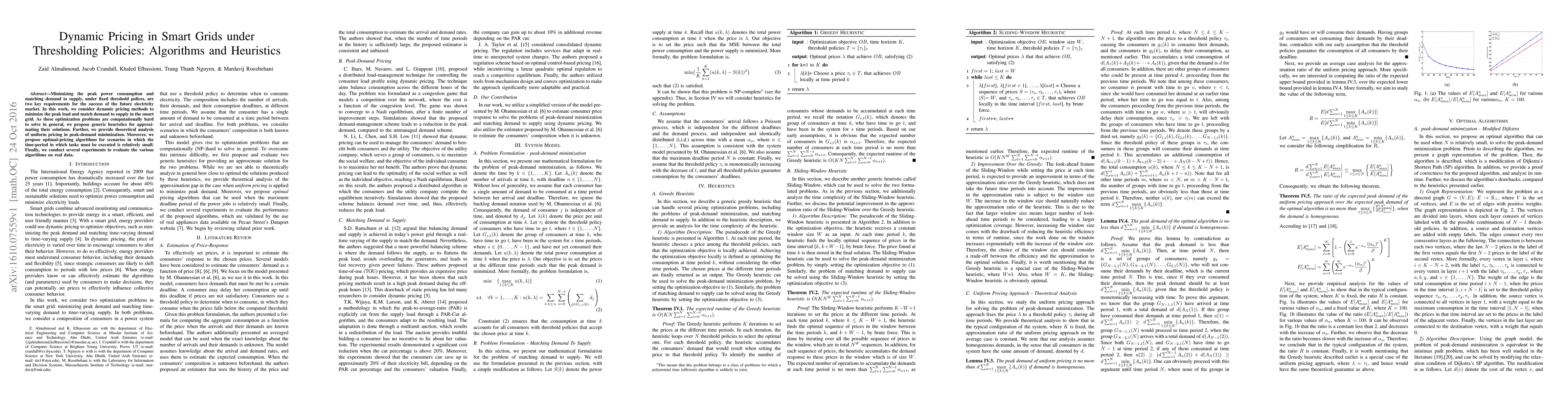 This paper proposes dynamic pricing algorithms and heuristics to minimize peak power consumption and balance demand with supply in smart grids under fixed threshold policies. It includes theoretical analysis of uniform pricing and optimal-pricing algorithms for constrained time periods, along with experiments on real data to evaluate performance.