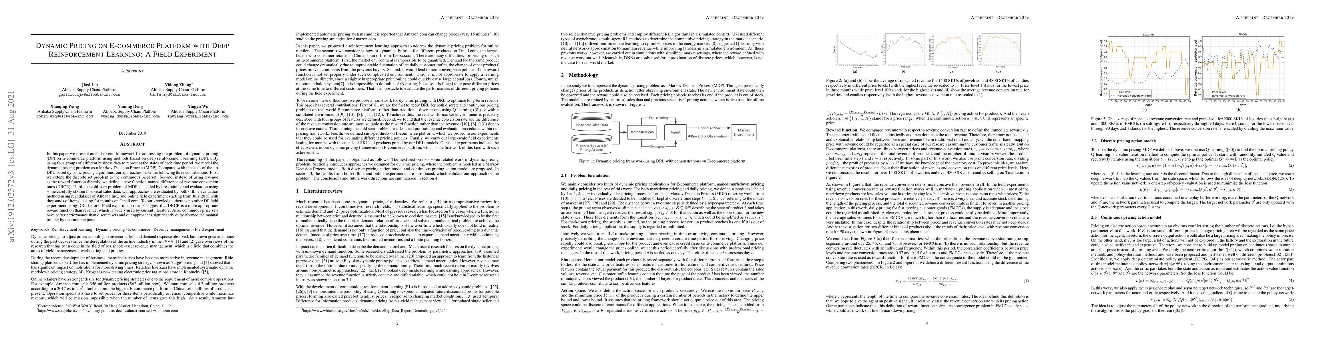 This paper proposes a deep reinforcement learning framework for dynamic pricing on e-commerce platforms, employing a continuous price set and a new reward function (difference of revenue conversion rates) to outperform traditional methods. Field experiments on Tmall.com demonstrate superior performance over manual pricing by experts.